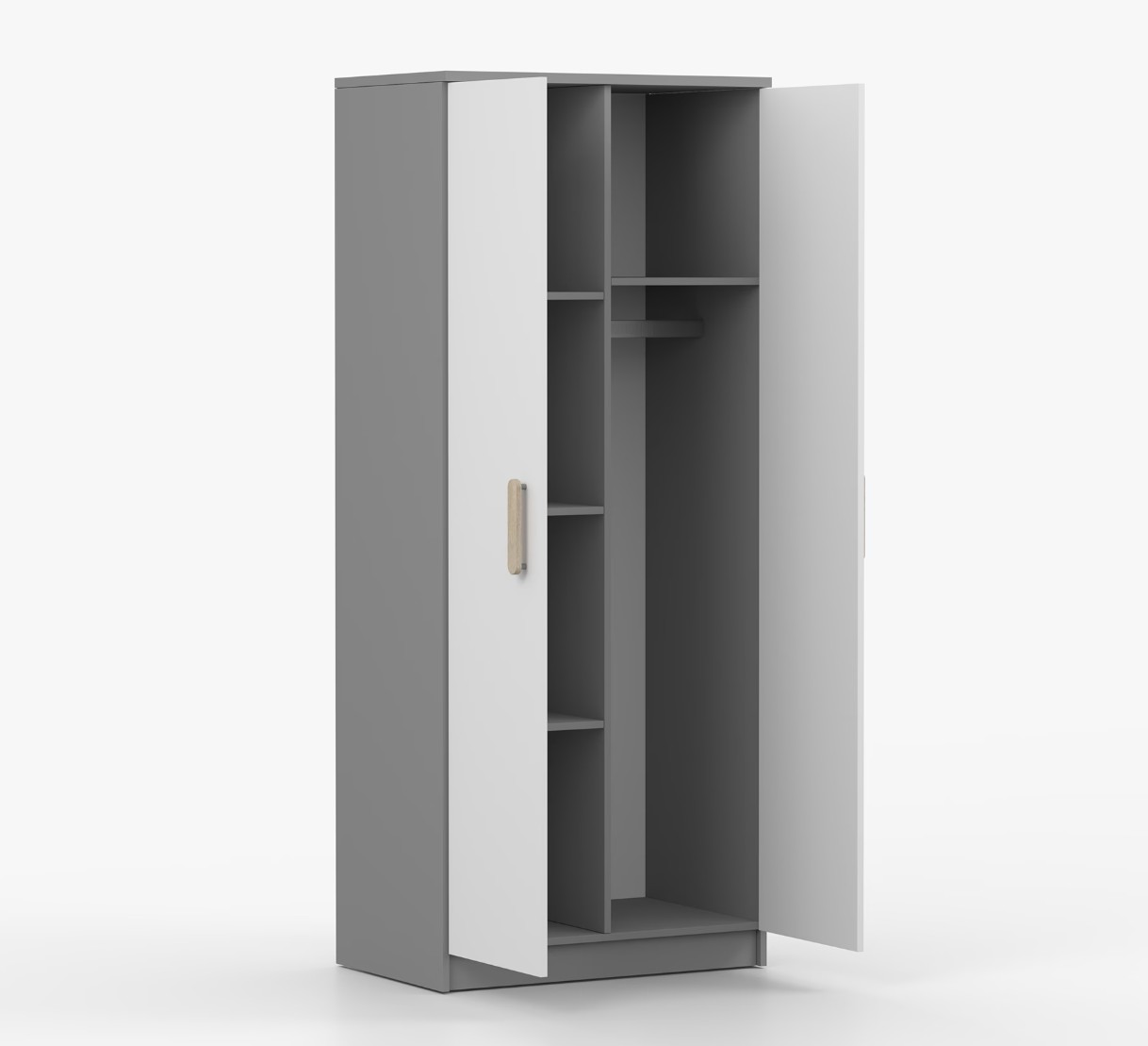 Dvoudveřová šatní skříň SCOUT s jednoduchým a moderním designem se hodí do každého typu domácnosti - ať už jde o dětský pokoj nebo studentův byt. Skříň je vyrobena z kvalitní laminované desky o tloušťce 16 mm s odolnými ABS hranami, které ji chrání před mechanickým poškozením. Šatní skříň poskytuje velký úložný prostor s dostatečným množstvím polic i místo na pověšení oblečení. Dveře jsou opatřené dřevěnými barevnými úchytkami a otevírají se tradičním způsobem.