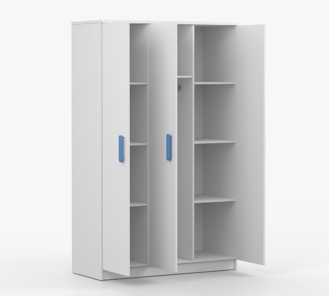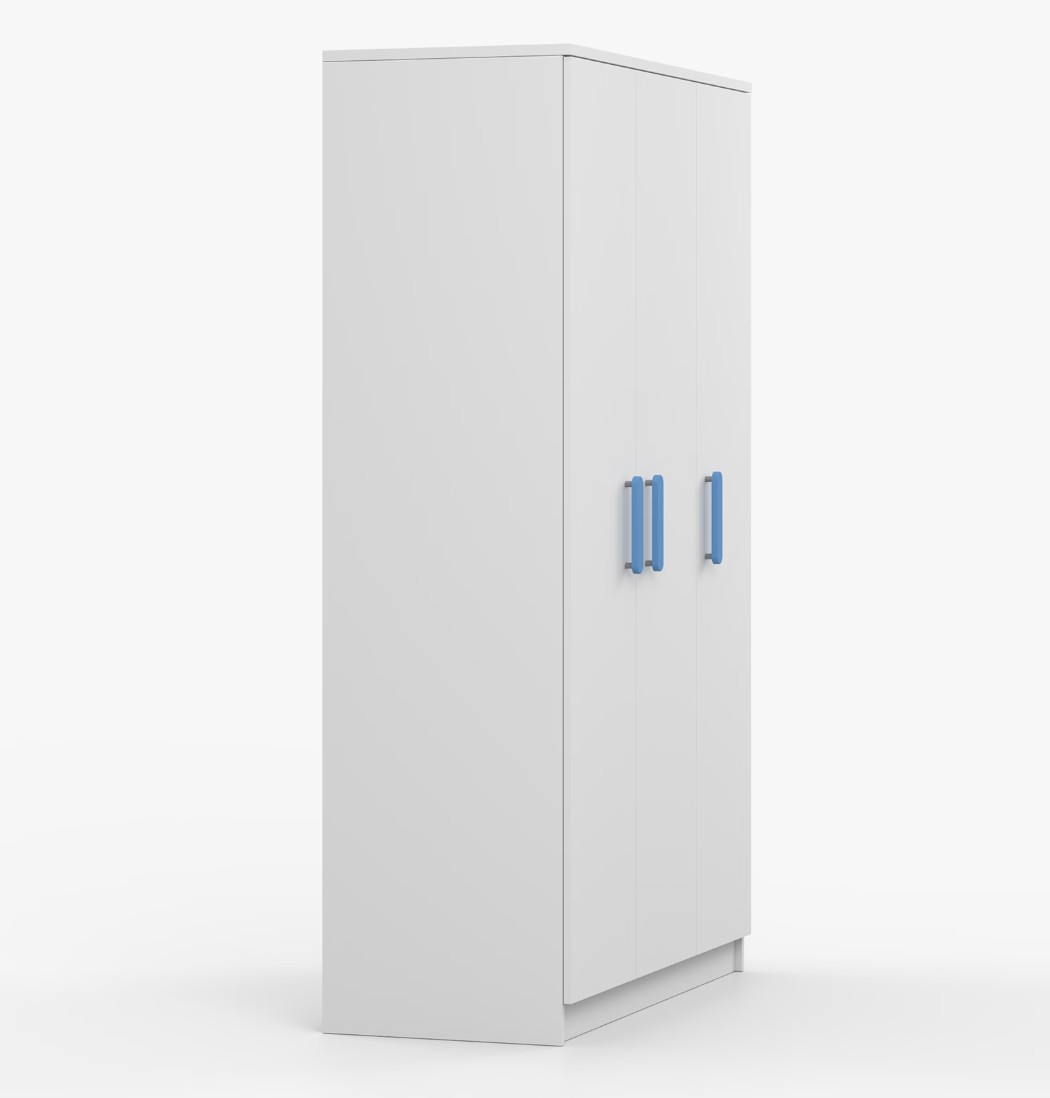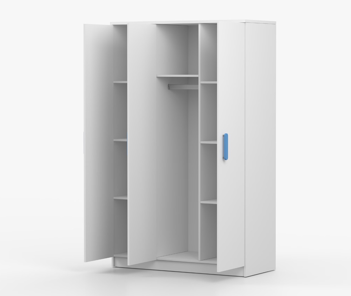 Třídveřová šatní skříň SMYK se vyznačuje praktickým úložným prostorem a velkou kapacitou. S jednoduchým a moderním designem se skříň SMYK hodí do každého typu domácnosti - ať už jde o dětský pokoj nebo studentův byt. Skříň je vyrobena z kvalitní laminované desky o tloušťce 16 mm s odolnými ABS hranami, které ji chrání před mechanickým poškozením. Šatní skříň poskytuje velký úložný prostor s dostatečným množstvím polic i místo na pověšení oblečení. Dveře jsou opatřené dřevěnými barevnými úchytkami a otevírají se tradičním způsobem.
