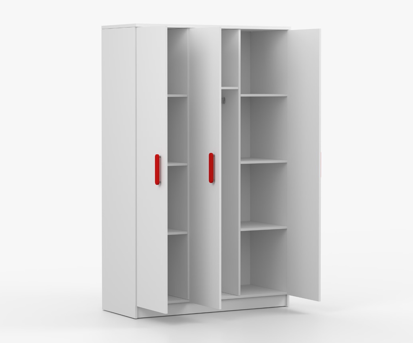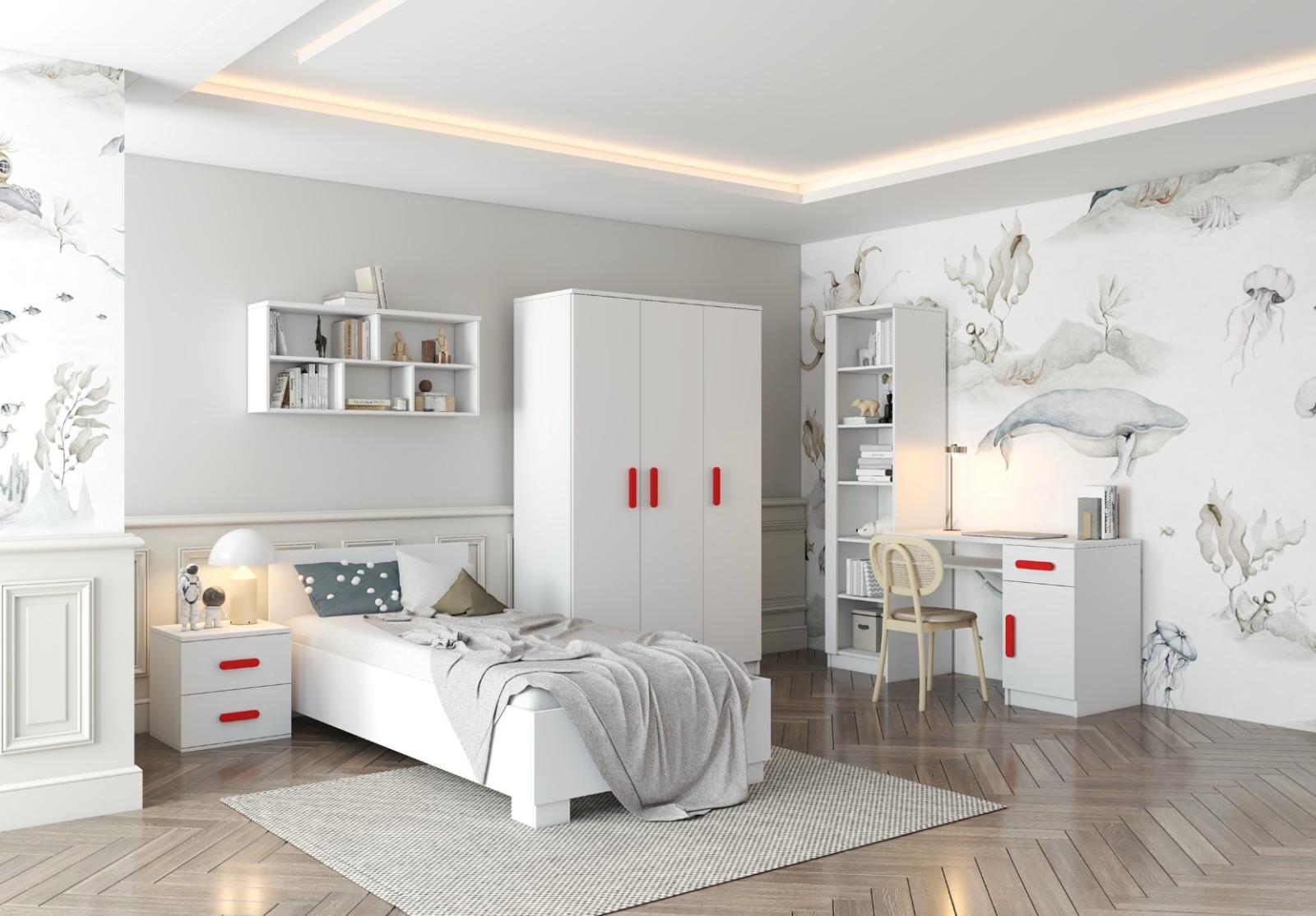 Třídveřová šatní skříň SMYK se vyznačuje praktickým úložným prostorem a velkou kapacitou. S jednoduchým a moderním designem se skříň SMYK hodí do každého typu domácnosti - ať už jde o dětský pokoj nebo studentův byt. Skříň je vyrobena z kvalitní laminované desky o tloušťce 16 mm s odolnými ABS hranami, které ji chrání před mechanickým poškozením. Šatní skříň poskytuje velký úložný prostor s dostatečným množstvím polic i místo na pověšení oblečení. Dveře jsou opatřené dřevěnými barevnými úchytkami a otevírají se tradičním způsobem.
