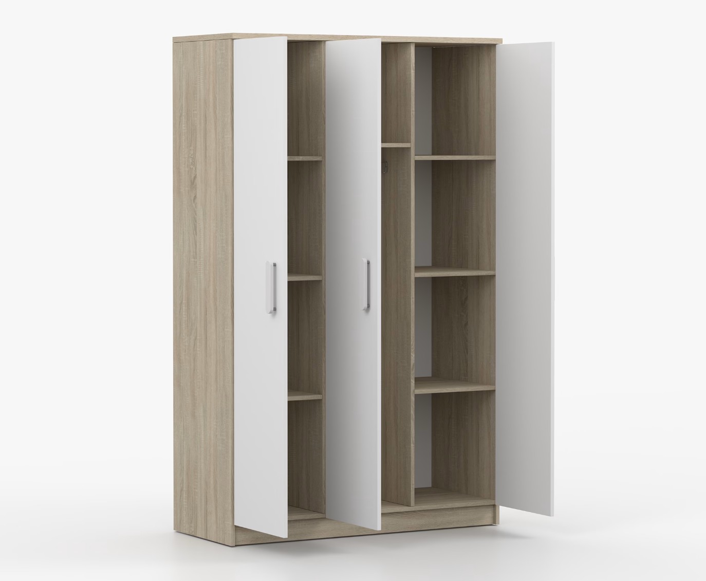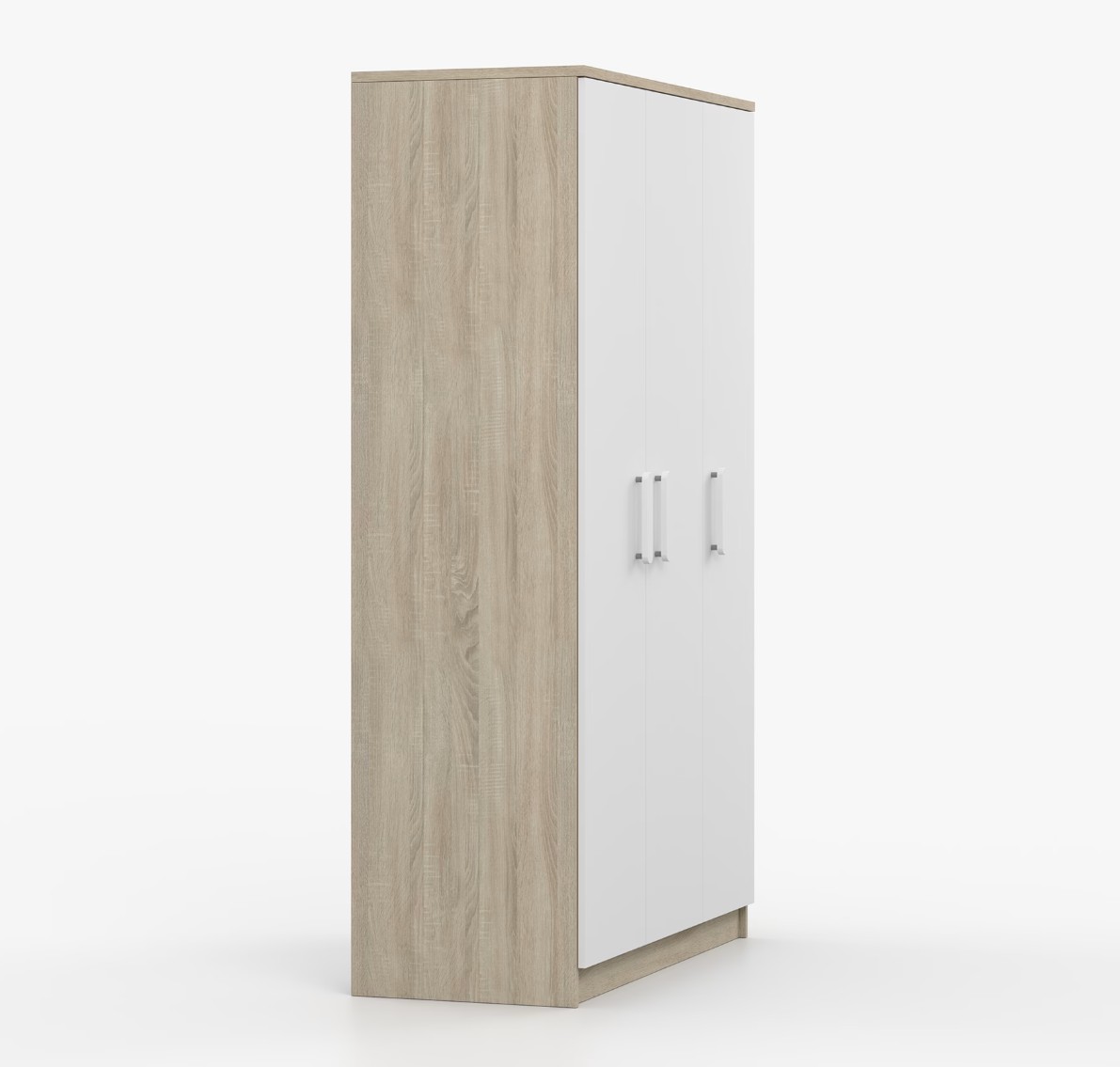 Třídveřová šatní skříň SMYK se vyznačuje praktickým úložným prostorem a velkou kapacitou. S jednoduchým a moderním designem se skříň SMYK hodí do každého typu domácnosti - ať už jde o dětský pokoj nebo studentův byt. Skříň je vyrobena z kvalitní laminované desky o tloušťce 16 mm s odolnými ABS hranami, které ji chrání před mechanickým poškozením. Šatní skříň poskytuje velký úložný prostor s dostatečným množstvím polic i místo na pověšení oblečení. Dveře jsou opatřené dřevěnými barevnými úchytkami a otevírají se tradičním způsobem.