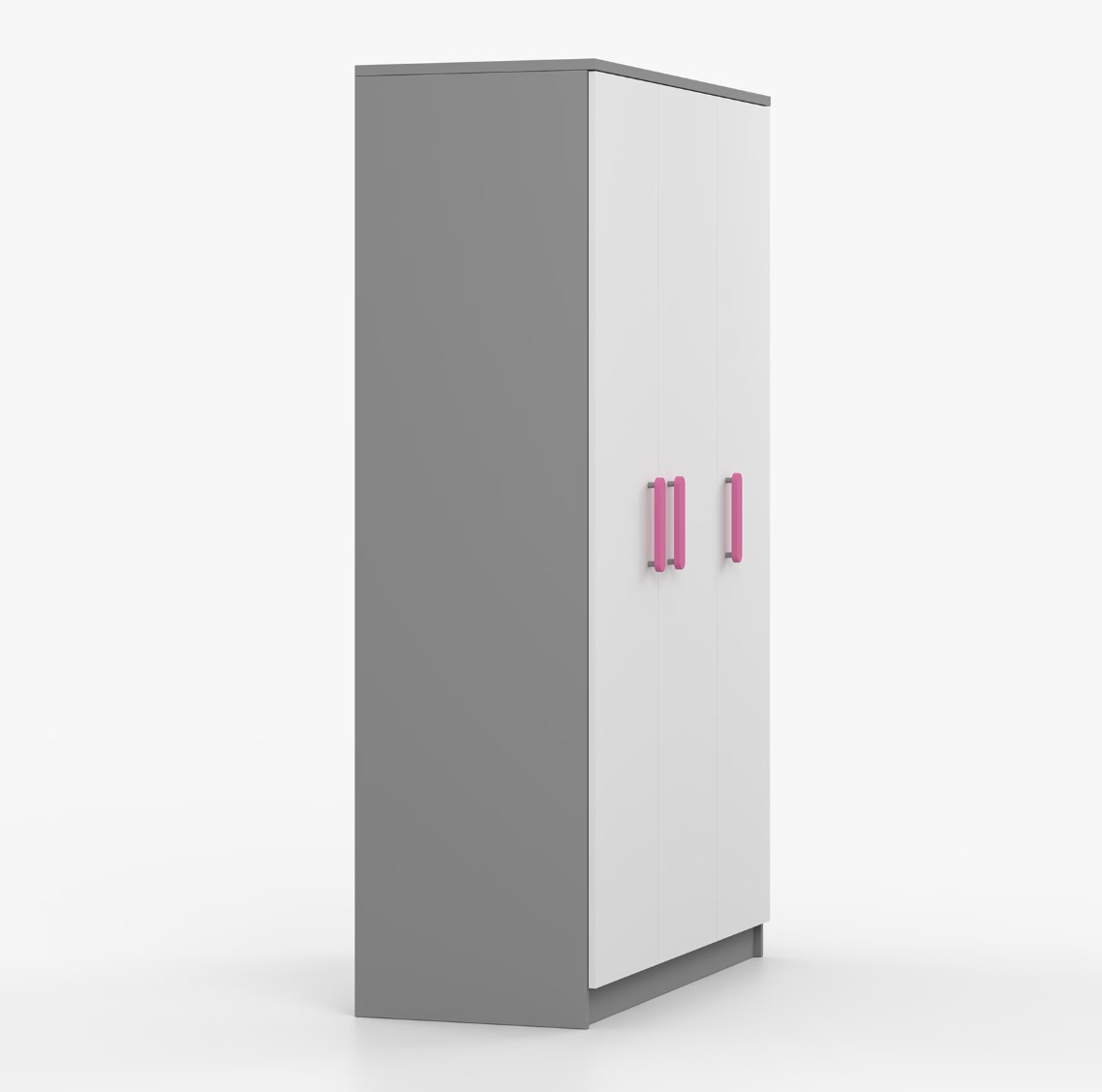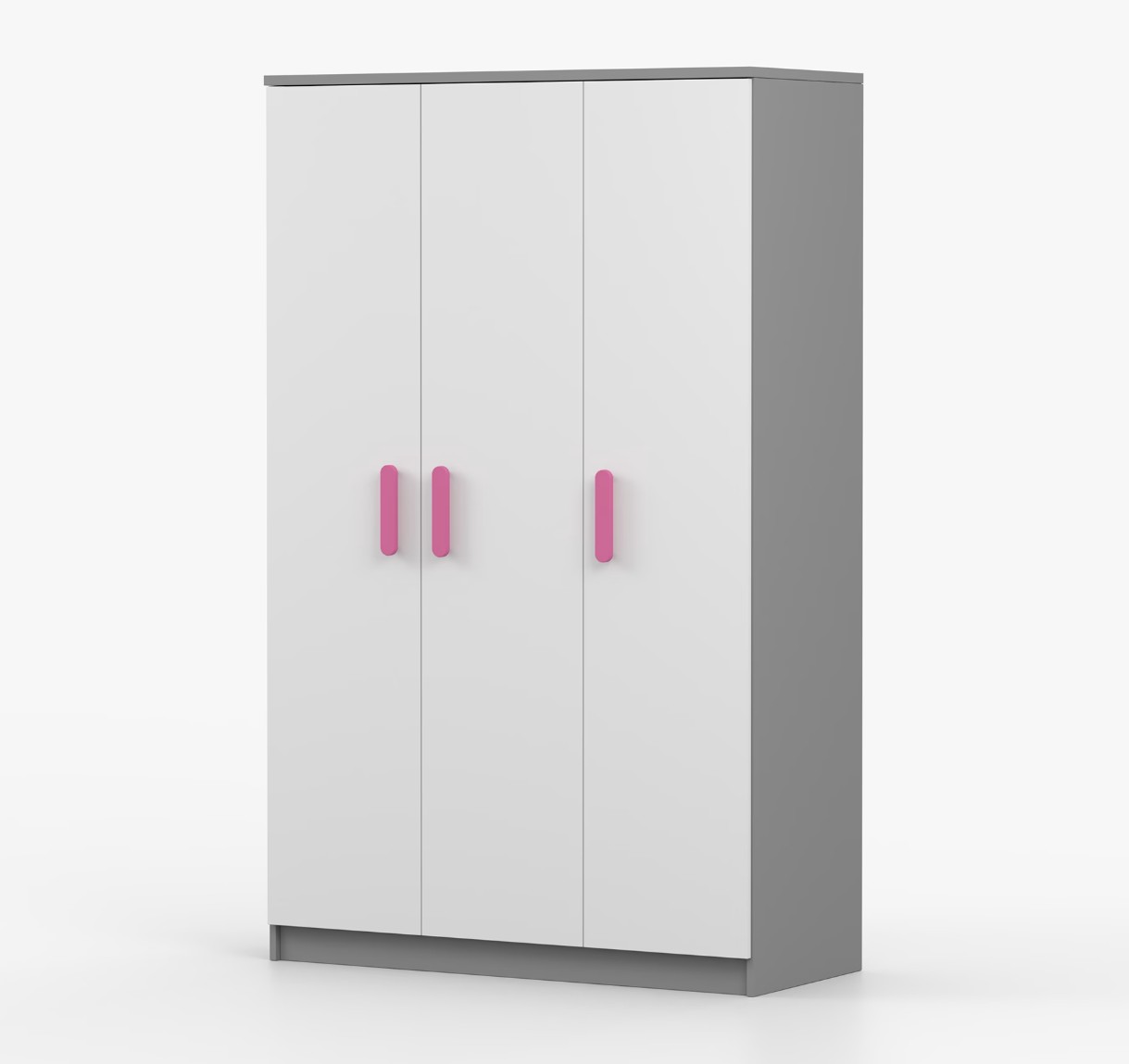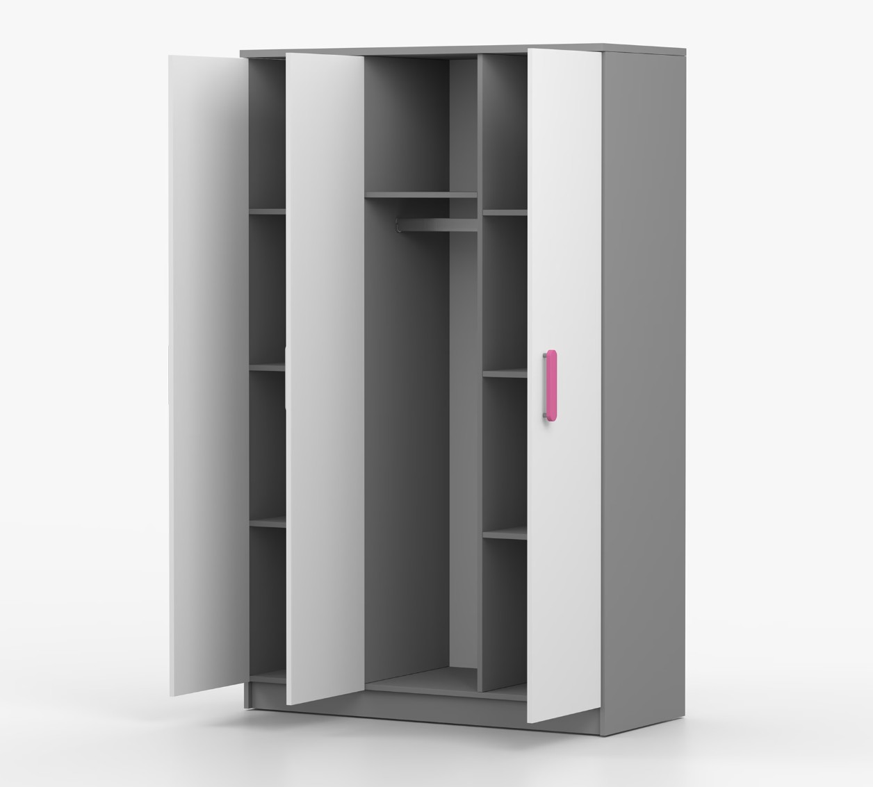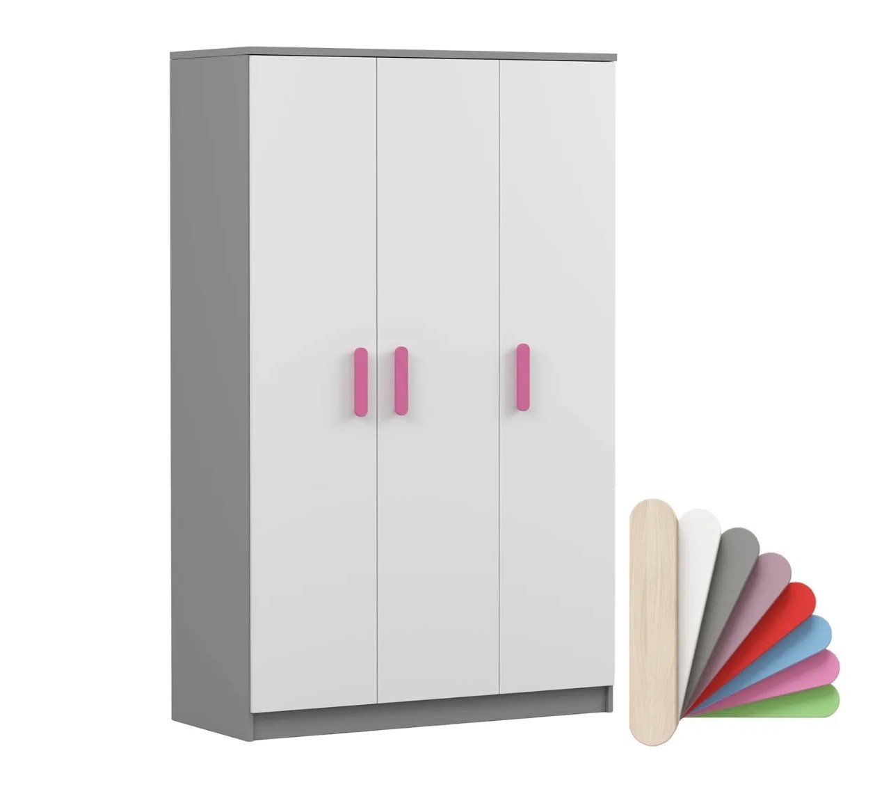 Třídveřová šatní skříň SMYK se vyznačuje praktickým úložným prostorem a velkou kapacitou. S jednoduchým a moderním designem se skříň SMYK hodí do každého typu domácnosti - ať už jde o dětský pokoj nebo studentův byt. Skříň je vyrobena z kvalitní laminované desky o tloušťce 16 mm s odolnými ABS hranami, které ji chrání před mechanickým poškozením. Šatní skříň poskytuje velký úložný prostor s dostatečným množstvím polic i místo na pověšení oblečení. Dveře jsou opatřené dřevěnými barevnými úchytkami a otevírají se tradičním způsobem.