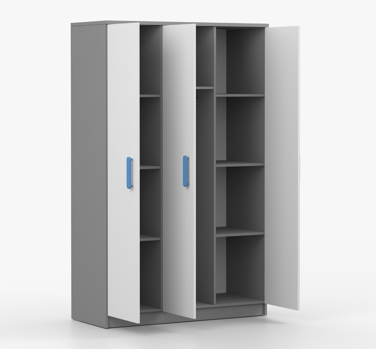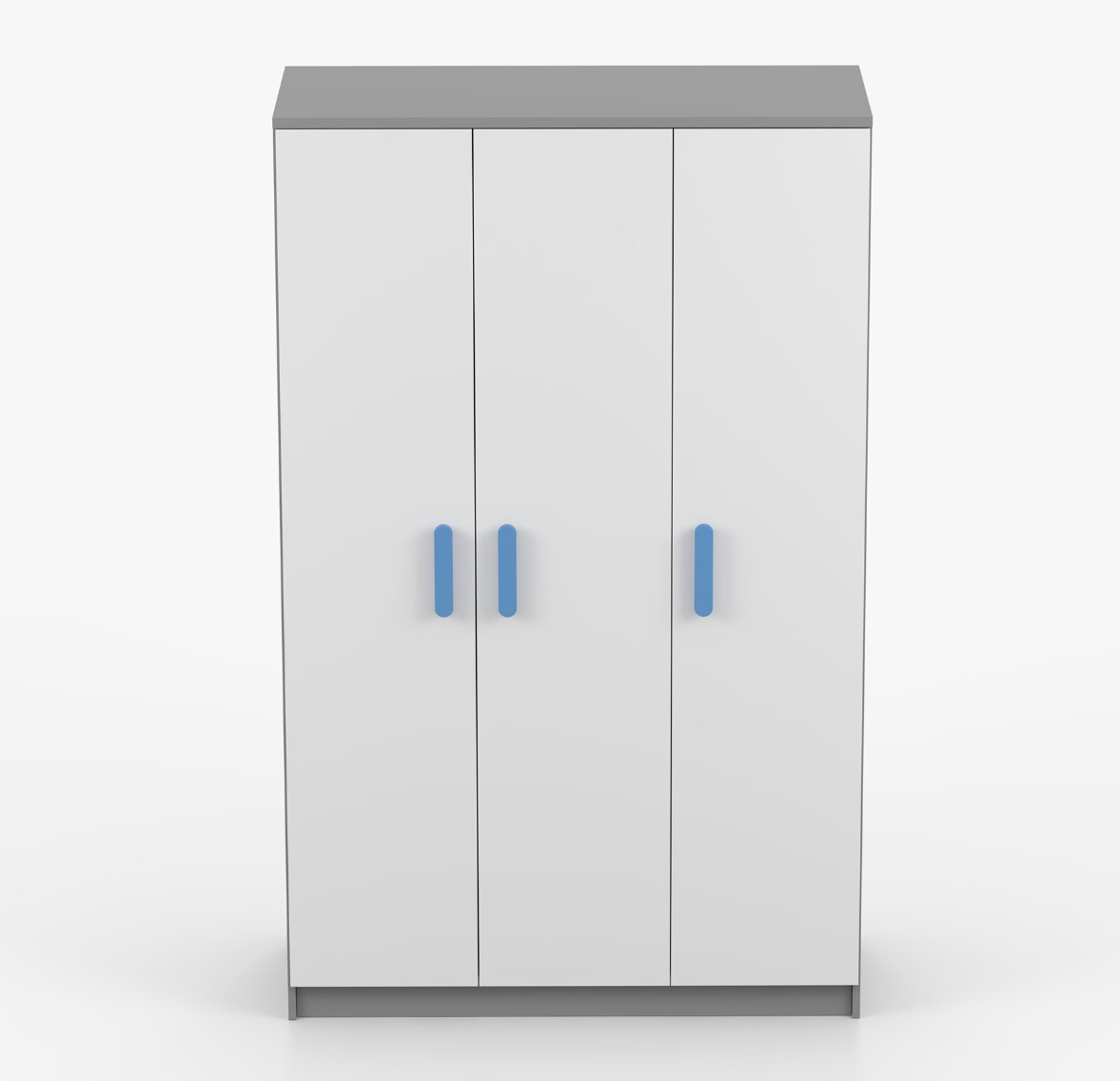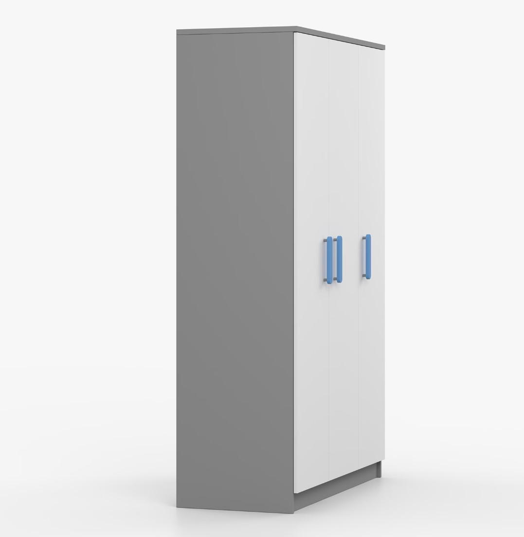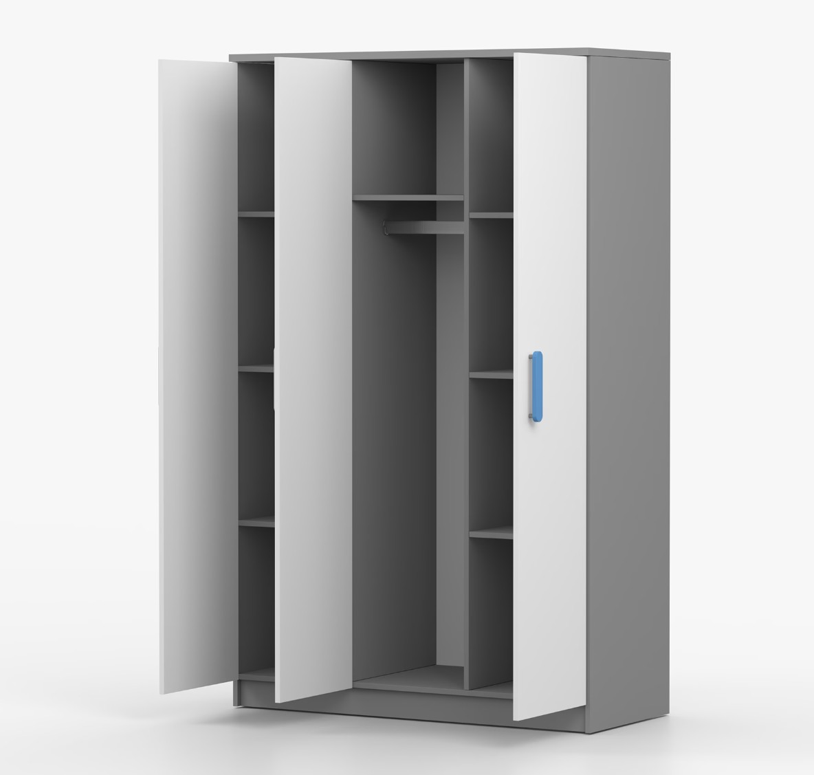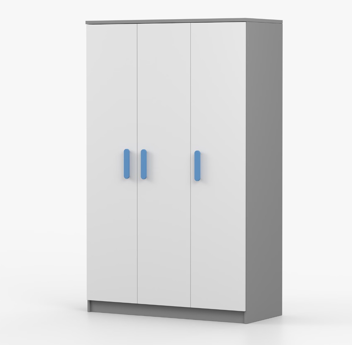 Třídveřová šatní skříň SMYK se vyznačuje praktickým úložným prostorem a velkou kapacitou. S jednoduchým a moderním designem se skříň SMYK hodí do každého typu domácnosti - ať už jde o dětský pokoj nebo studentův byt. Skříň je vyrobena z kvalitní laminované desky o tloušťce 16 mm s odolnými ABS hranami, které ji chrání před mechanickým poškozením. Šatní skříň poskytuje velký úložný prostor s dostatečným množstvím polic i místo na pověšení oblečení. Dveře jsou opatřené dřevěnými barevnými úchytkami a otevírají se tradičním způsobem.