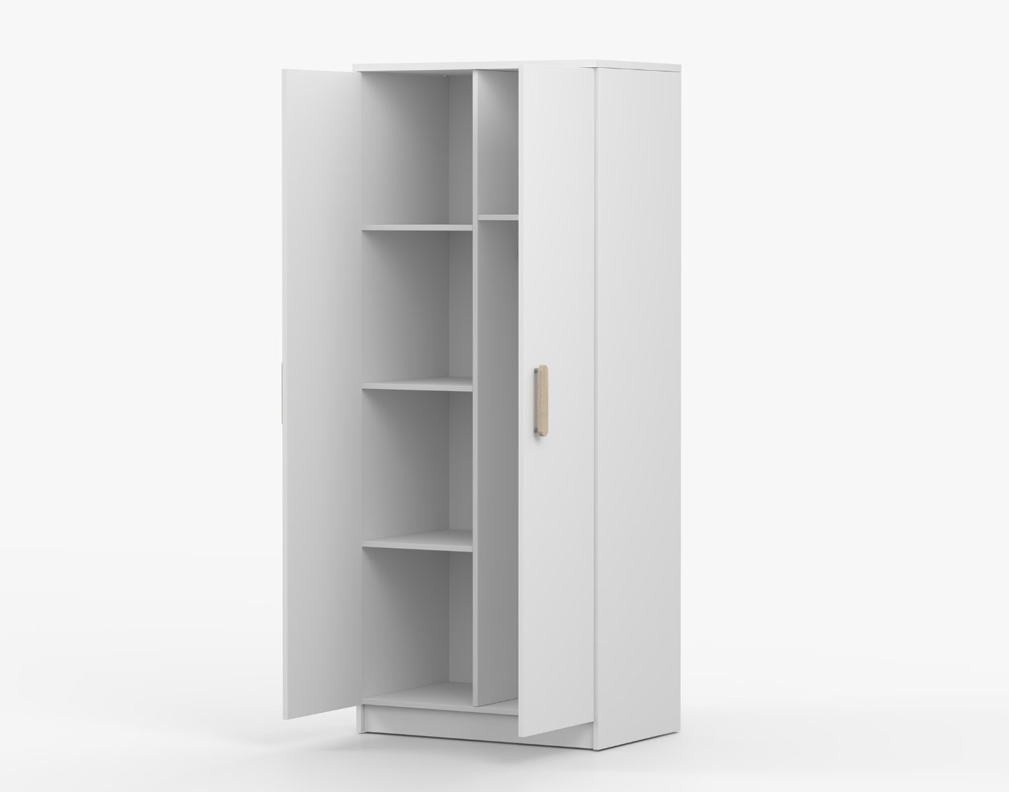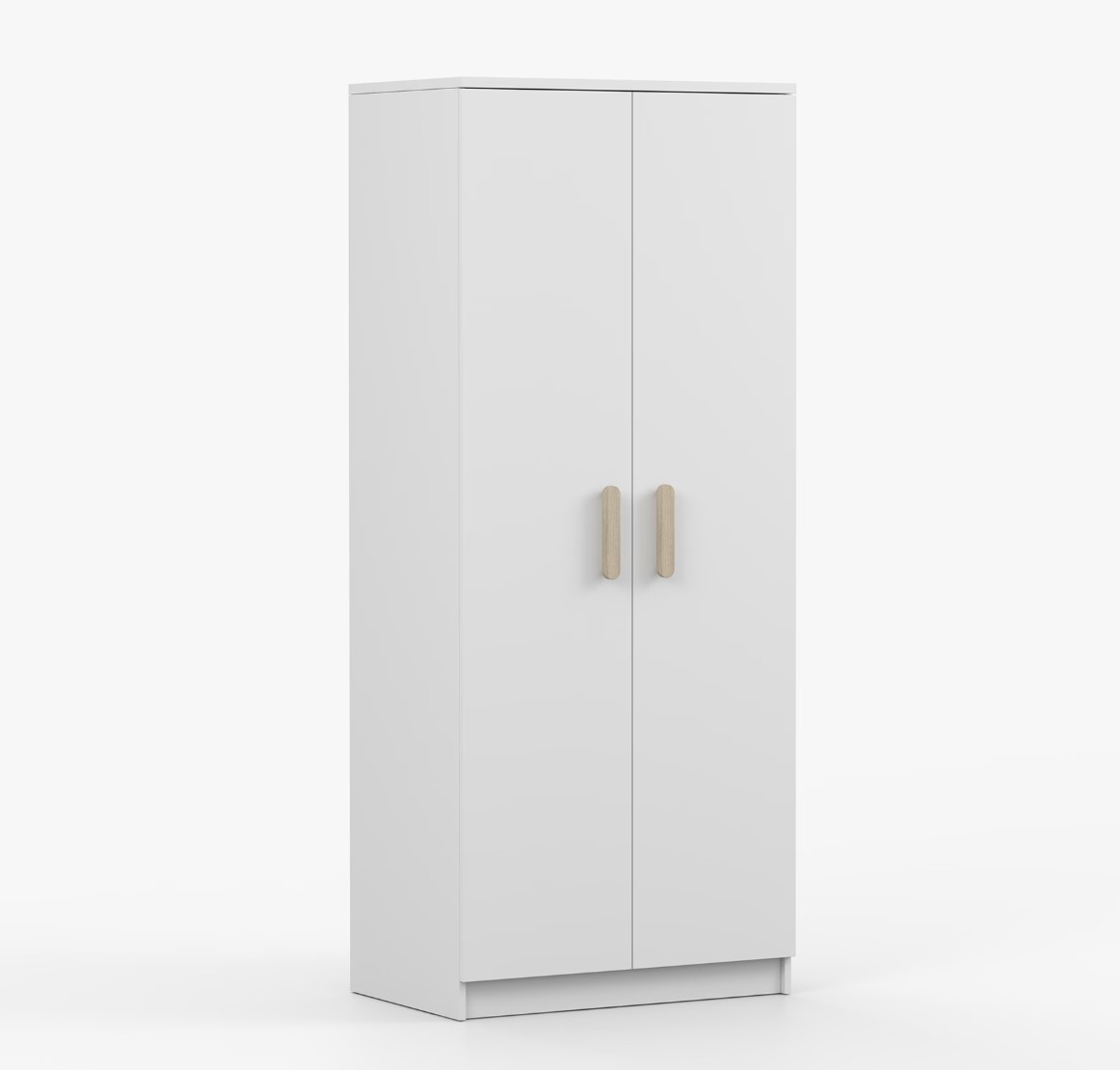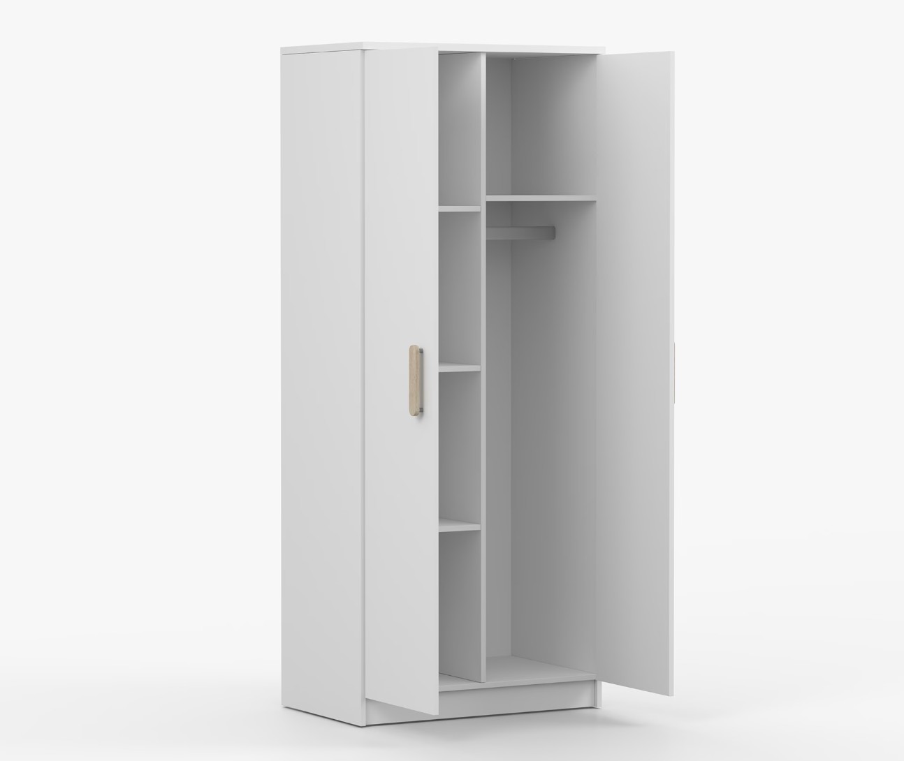Dvoudveřová šatní skříň SMYK s jednoduchým a moderním designem se hodí do každého typu domácnosti - ať už jde o dětský pokoj nebo studentův byt. Skříň je vyrobena z kvalitní laminované desky o tloušťce 16 mm s odolnými ABS hranami, které ji chrání před mechanickým poškozením. Šatní skříň poskytuje velký úložný prostor s dostatečným množstvím polic i místo na pověšení oblečení. Dveře jsou opatřené dřevěnými barevnými úchytkami a otevírají se tradičním způsobem.