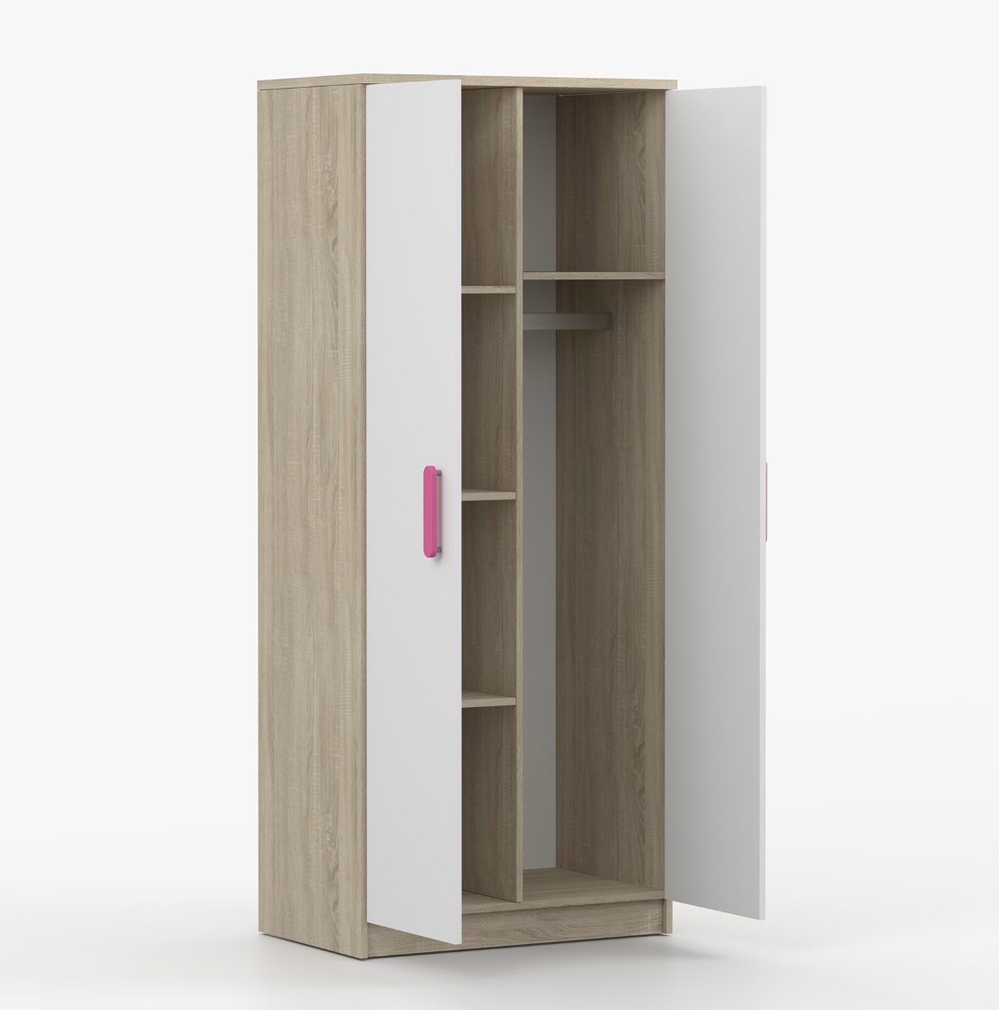Dvoudveřová šatní skříň SMYK s jednoduchým a moderním designem se hodí do každého typu domácnosti - ať už jde o dětský pokoj nebo studentův byt. Skříň je vyrobena z kvalitní laminované desky o tloušťce 16 mm s odolnými ABS hranami, které ji chrání před mechanickým poškozením. Šatní skříň poskytuje velký úložný prostor s dostatečným množstvím polic i místo na pověšení oblečení. Dveře jsou opatřené dřevěnými barevnými úchytkami a otevírají se tradičním způsobem.