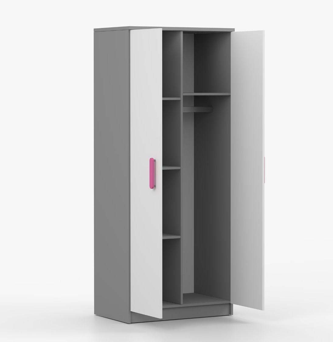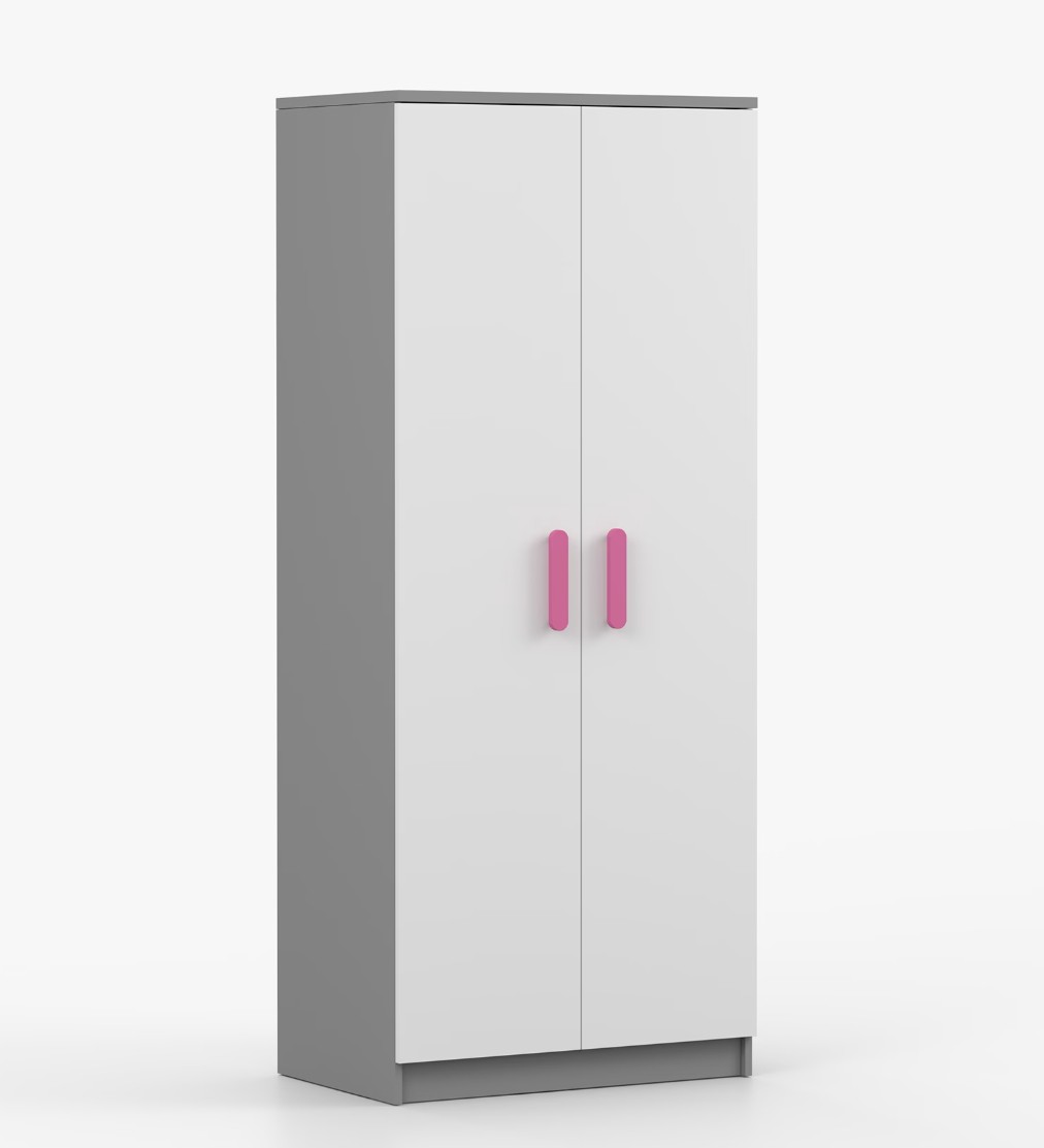Dvoudveřová šatní skříň SMYK s jednoduchým a moderním designem se hodí do každého typu domácnosti - ať už jde o dětský pokoj nebo studentův byt. Skříň je vyrobena z kvalitní laminované desky o tloušťce 16 mm s odolnými ABS hranami, které ji chrání před mechanickým poškozením. Šatní skříň poskytuje velký úložný prostor s dostatečným množstvím polic i místo na pověšení oblečení. Dveře jsou opatřené dřevěnými barevnými úchytkami a otevírají se tradičním způsobem.