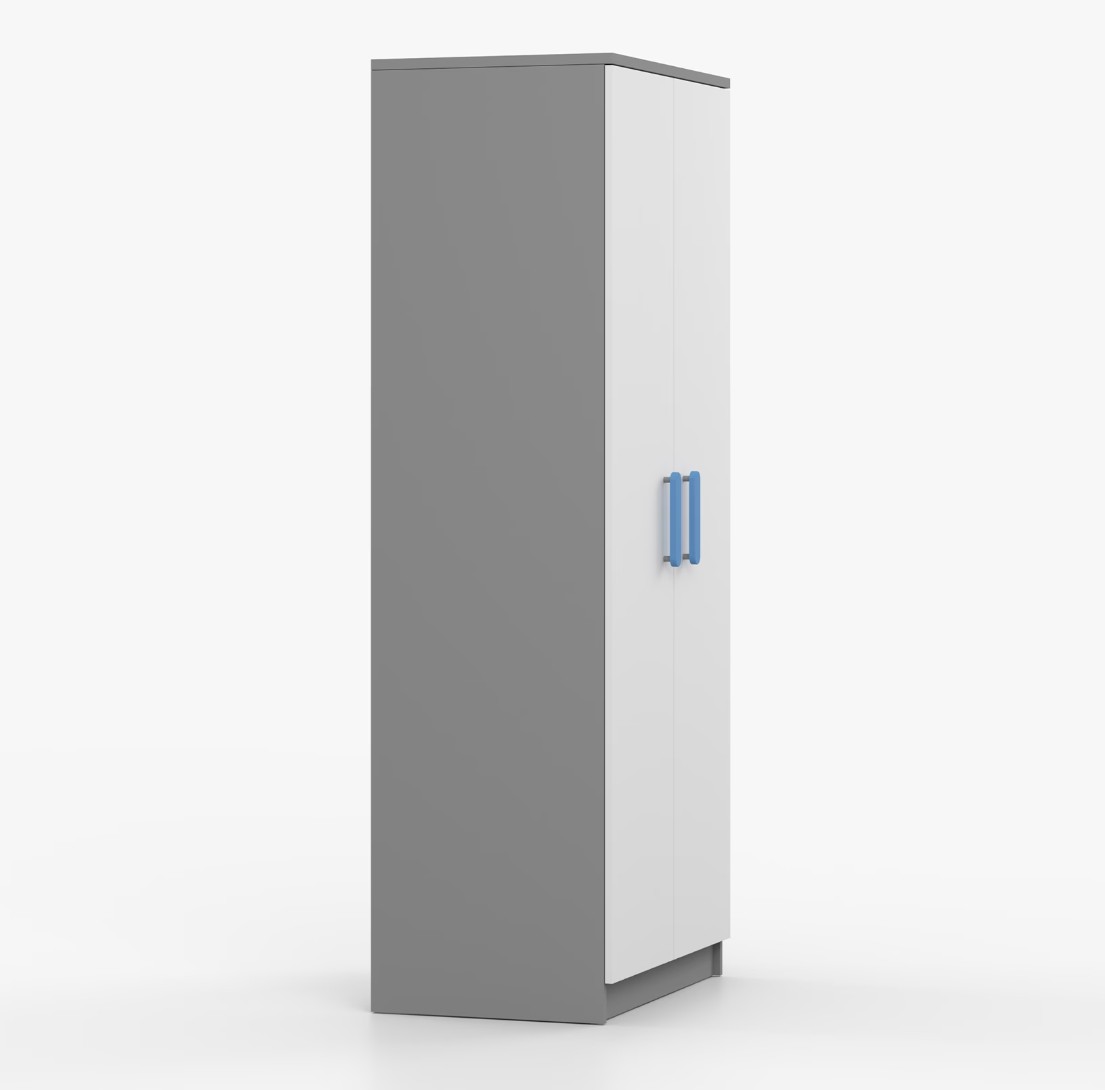 Dvoudveřová šatní skříň SMYK s jednoduchým a moderním designem se hodí do každého typu domácnosti - ať už jde o dětský pokoj nebo studentův byt. Skříň je vyrobena z kvalitní laminované desky o tloušťce 16 mm s odolnými ABS hranami, které ji chrání před mechanickým poškozením. Šatní skříň poskytuje velký úložný prostor s dostatečným množstvím polic i místo na pověšení oblečení. Dveře jsou opatřené dřevěnými barevnými úchytkami a otevírají se tradičním způsobem.