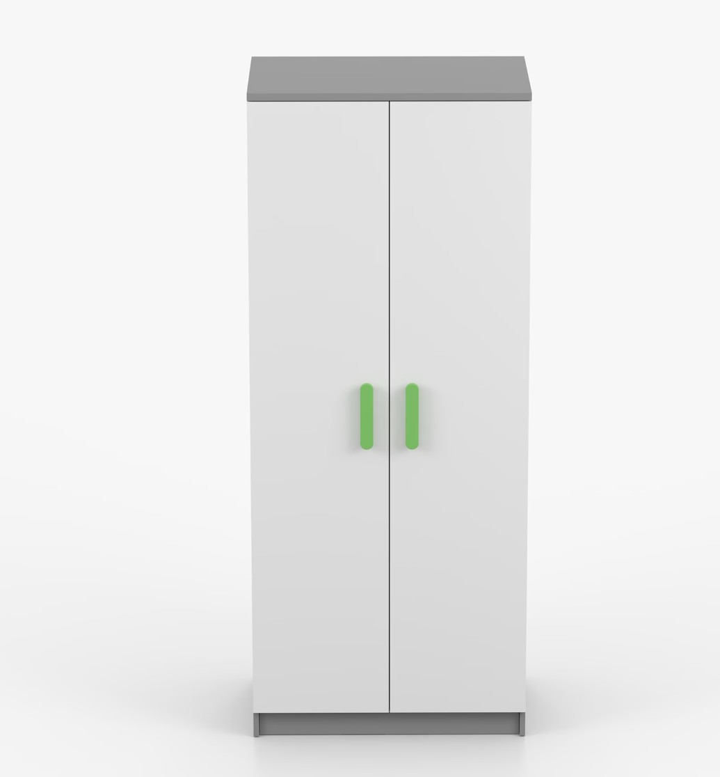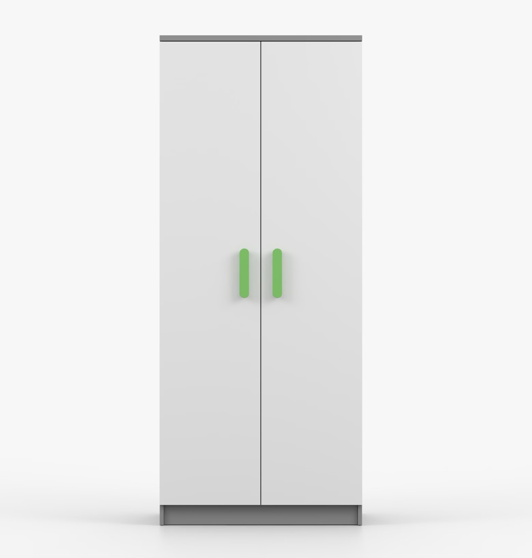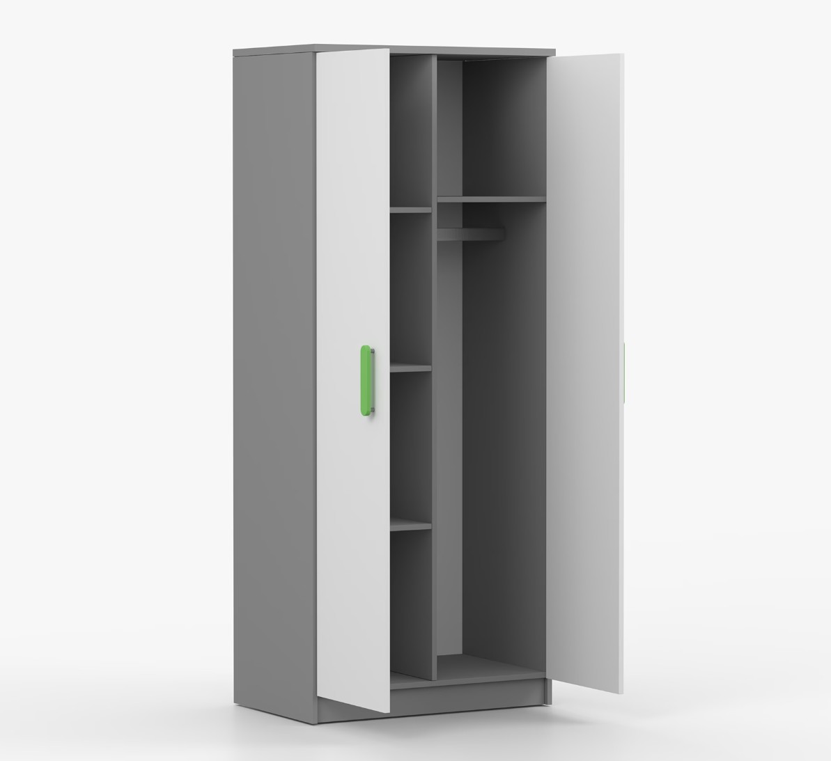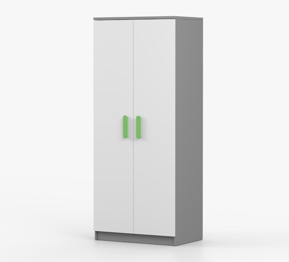 Dvoudveřová šatní skříň SMYK s jednoduchým a moderním designem se hodí do každého typu domácnosti - ať už jde o dětský pokoj nebo studentův byt. Skříň je vyrobena z kvalitní laminované desky o tloušťce 16 mm s odolnými ABS hranami, které ji chrání před mechanickým poškozením. Šatní skříň poskytuje velký úložný prostor s dostatečným množstvím polic i místo na pověšení oblečení. Dveře jsou opatřené dřevěnými barevnými úchytkami a otevírají se tradičním způsobem.