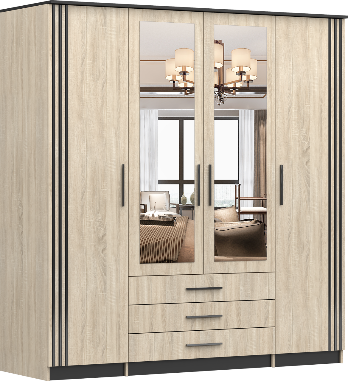 Šatní skříň STELVIO 200 se vyznačuje moderním vzhledem, praktickým úložným prostorem a velkou kapacitou. Skříň má tři dveře s ozdobnými černými lištami a zrcadlem, které opticky prosvětlí a zvětší místnost. Dveře se otevírají klasickým způsobem pomocí černých úchytek z PVC. Odkládací prostor je rozdělen na tři části - po vnějších stranách je prostor se šatními tyčemi pro zavěšení delších oděvů s policemi nad nimi a v prostřední části jsou 3 prostorné police, které prostor dělí do 4 komor se 3 šuplíky v dolní části. Skříň je vyrobena z vysoce kvalitní LTD desky o tloušťce 16 mm s odolnými ABS hranami.