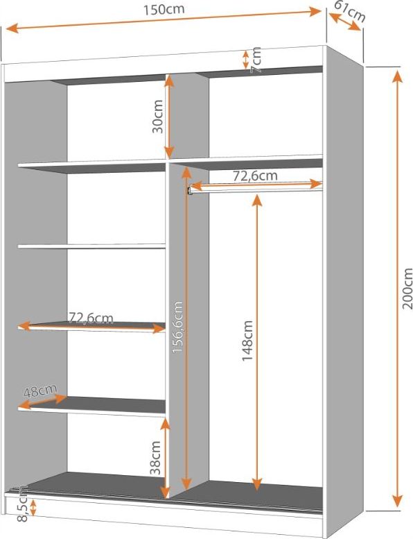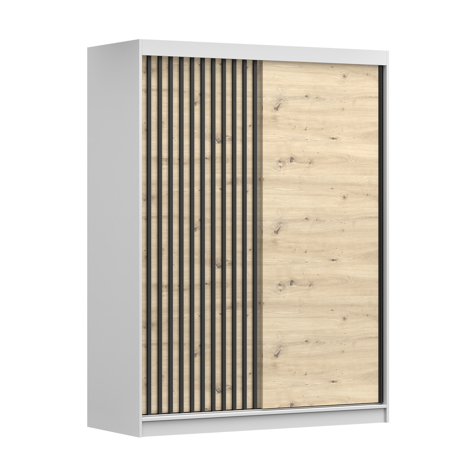 VISION 10 je moderní skříň s posuvnými dveřmi v zajímavých barevných kombinacích, která se hodí do mnoha interiérů. Systém posuvných dveří šetří místo v místnosti a zjednodušuje otevírání a zavírání. Dveře v dekoru dubu artisan s úchytkami z hliníku a s dekorativními černými lištami se posouvají na kolečkách s kuličkovými ložisky, které zajišťují hladký a tichý pohyb. Skříň je rozdělena na dvě části, které jsou vybaveny nejen prostornými policemi a závěsnou tyčí, ale také dostatečným prostorem pro uložení velkého množství oblečení, což z ní dělá praktickou volbu pro každou domácnost.