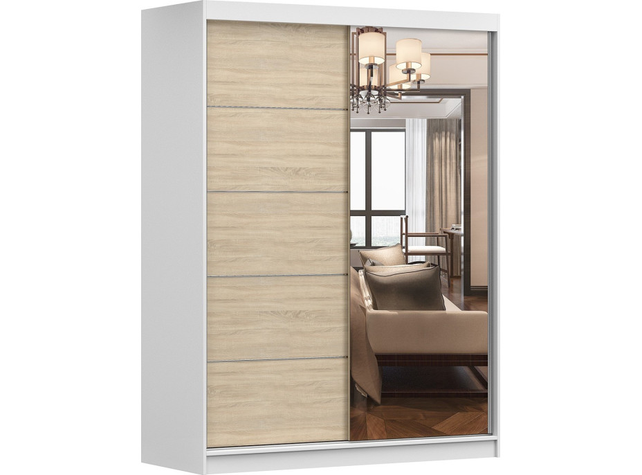 Skříň je rozdělena na dvě části, které jsou vybaveny nejen prostornými policemi a závěsnou tyčí, ale také dostatečným prostorem pro uložení velkého množství oblečení, což z ní dělá praktickou volbu pro každou domácnost. Na přední straně je umístěno zrcadlo, které osvětluje místnost a opticky ji zvětšuje.