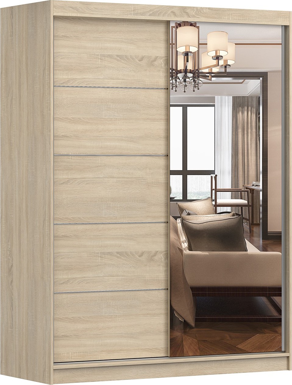 Skříň je rozdělena na dvě části, které jsou vybaveny nejen prostornými policemi a závěsnou tyčí, ale také dostatečným prostorem pro uložení velkého množství oblečení, což z ní dělá praktickou volbu pro každou domácnost. Na přední straně je umístěno zrcadlo, které osvětluje místnost a opticky ji zvětšuje.