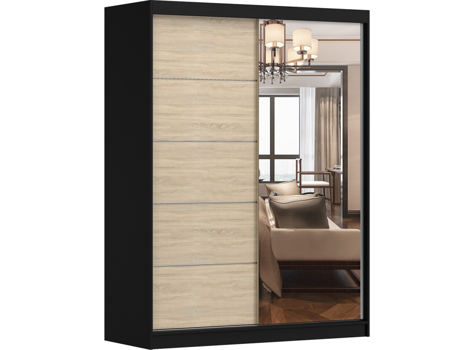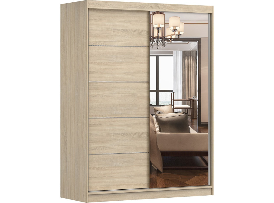 Skříň je rozdělena na dvě části, které jsou vybaveny nejen prostornými policemi a závěsnou tyčí, ale také dostatečným prostorem pro uložení velkého množství oblečení, což z ní dělá praktickou volbu pro každou domácnost. Na přední straně je umístěno zrcadlo, které osvětluje místnost a opticky ji zvětšuje.