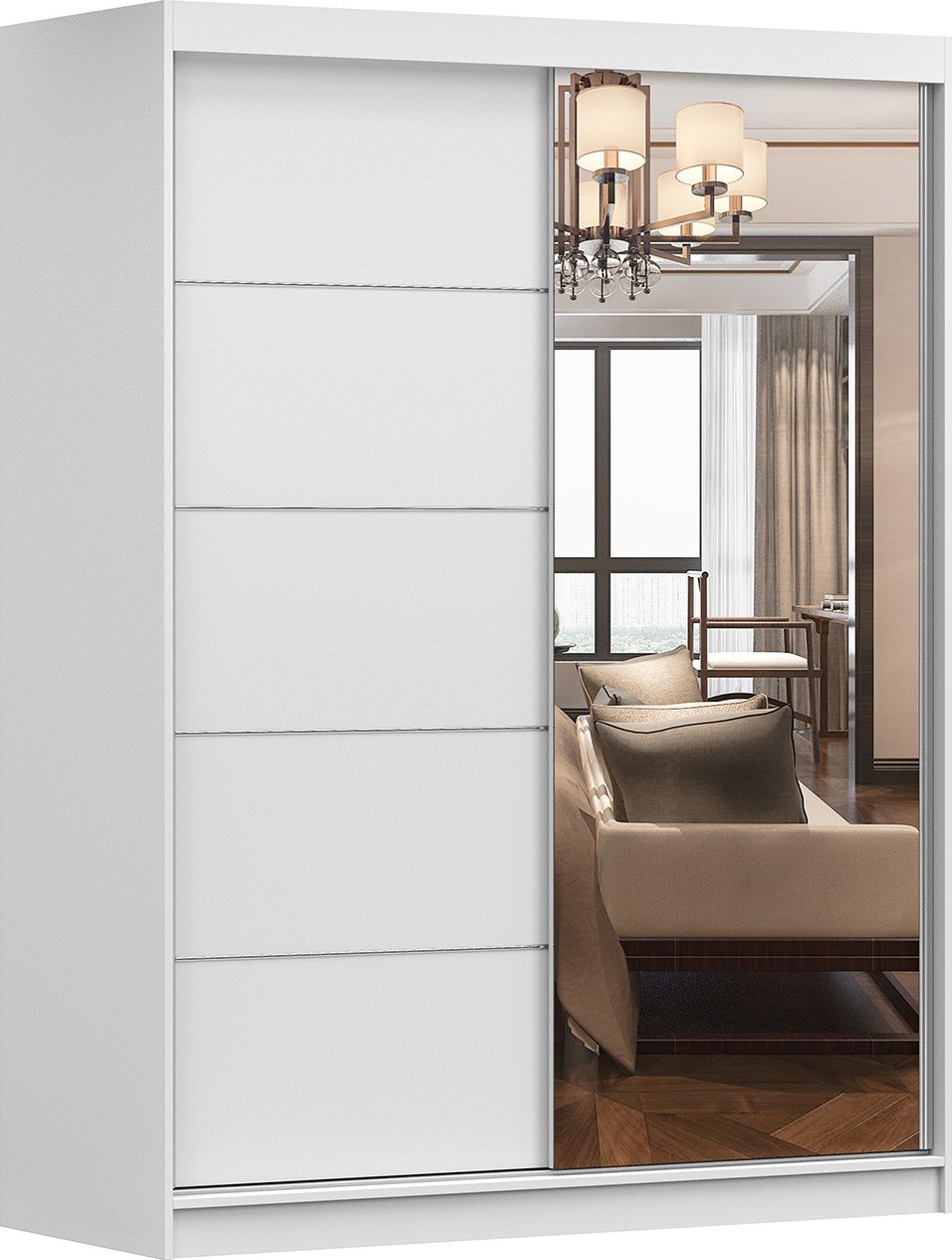 Skříň je rozdělena na dvě části, které jsou vybaveny nejen prostornými policemi a závěsnou tyčí, ale také dostatečným prostorem pro uložení velkého množství oblečení, což z ní dělá praktickou volbu pro každou domácnost. Na přední straně je umístěno zrcadlo, které osvětluje místnost a opticky ji zvětšuje.