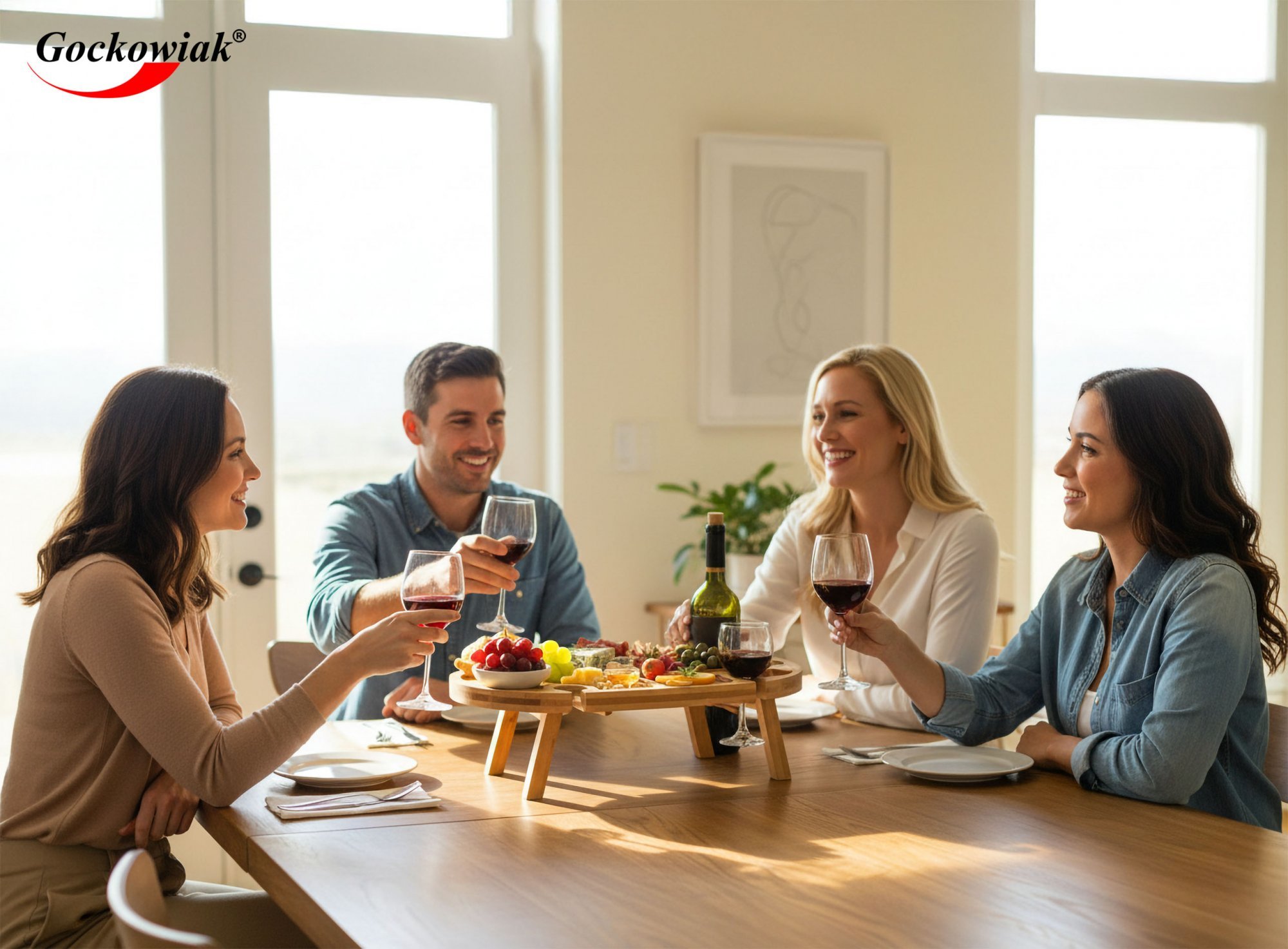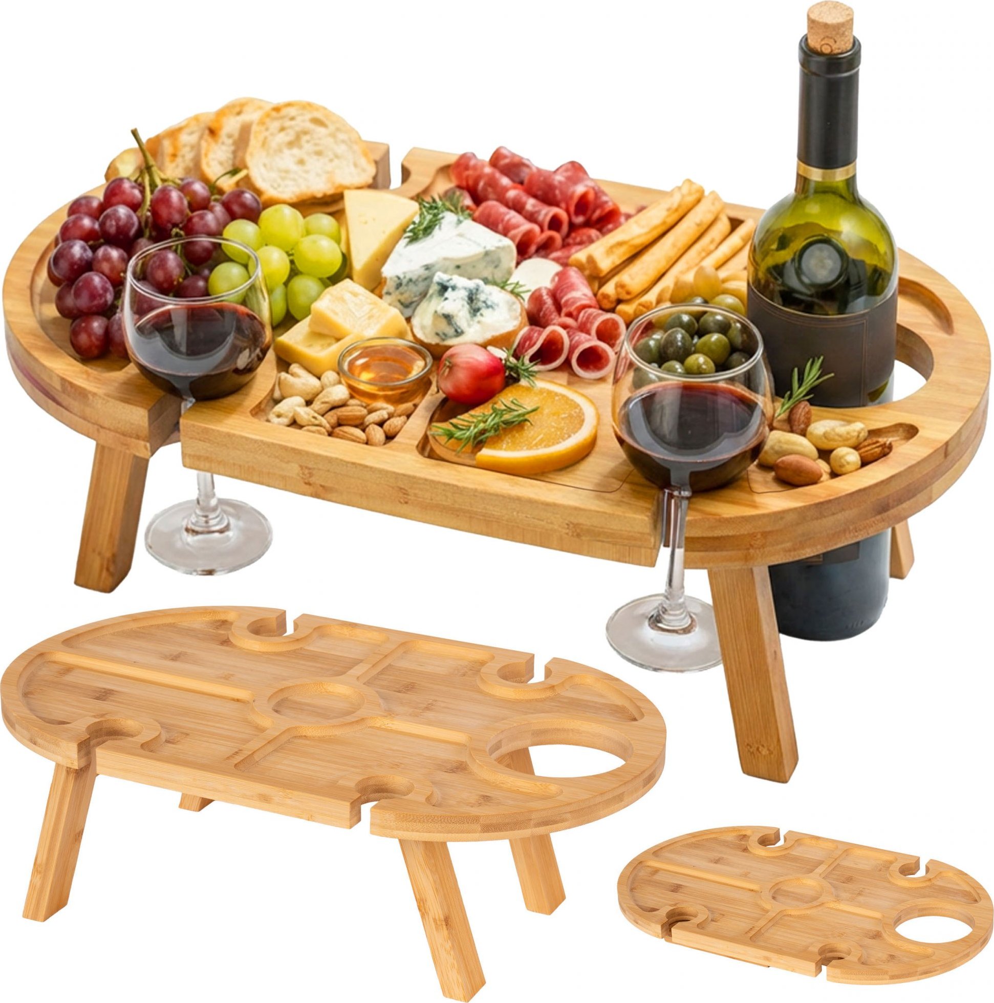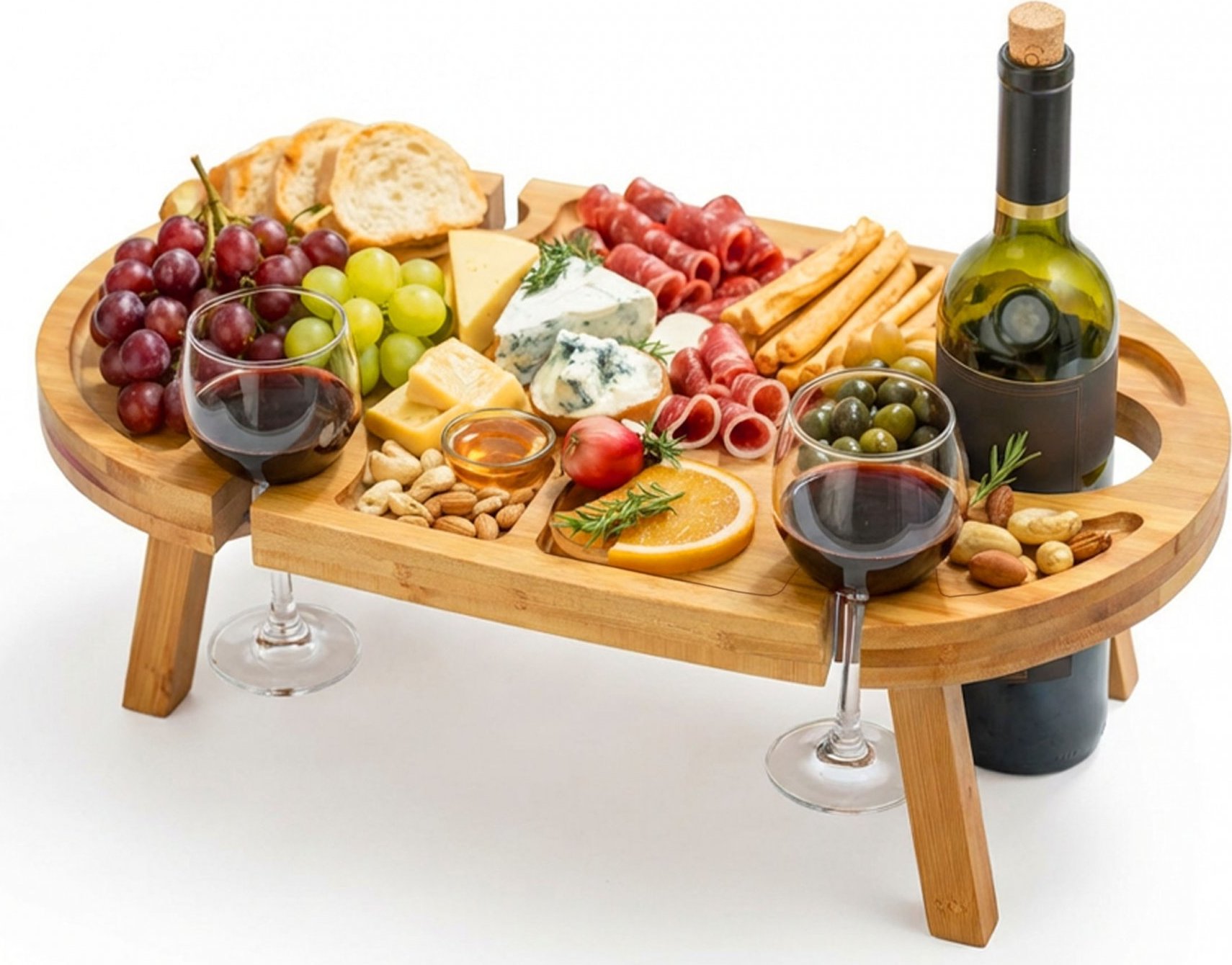 Sýrové prkénko Delia kombinuje styl a funkčnost, je ideální pro setkání s přáteli, večery s vínem a rodinné oslavy. Je vyrobeno z odolného bambusu, pyšní se přirozeným vzhledem a zároveň zajišťuje pohodlí a dlouhou životnost. Jeho skládací design a stabilní nohy dodávají prkénku na stole působivý vzhled a ve složeném stavu zabírá minimum místa. Promyšlené uspořádání umožňuje elegantní servírování sýrů, uzenin, ovoce a různých občerstvení. Další prostor pro láhev vína a speciální výřezy pro čtyři sklenice vytvářejí harmonický celek, který zdůrazňuje jedinečný charakter každé příležitosti.