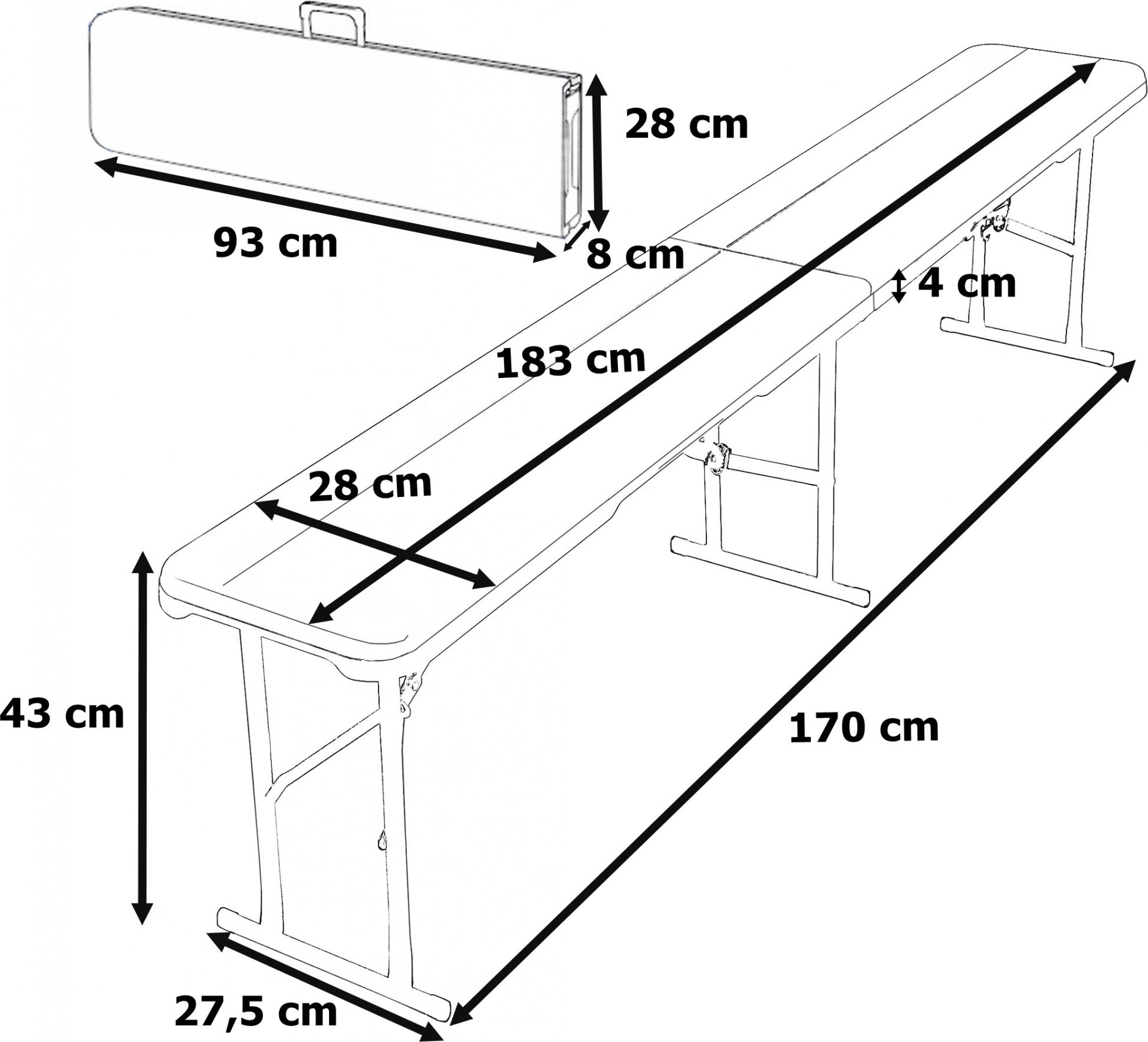 - Rozměry složené lavičky (kufru): 93 cm x 28 cm x 8 cm