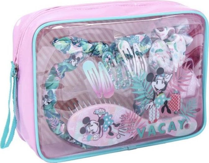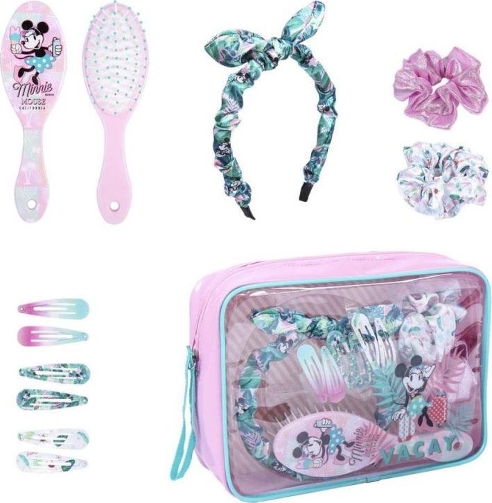 Set doplňků do vlasů pro holčičky s motivem Minnie v kosmetické taštičce. Balení obsahuje: kartáč čelenku 2 gumičky 6 sponek kosmetickou taštičkuVlastnosti