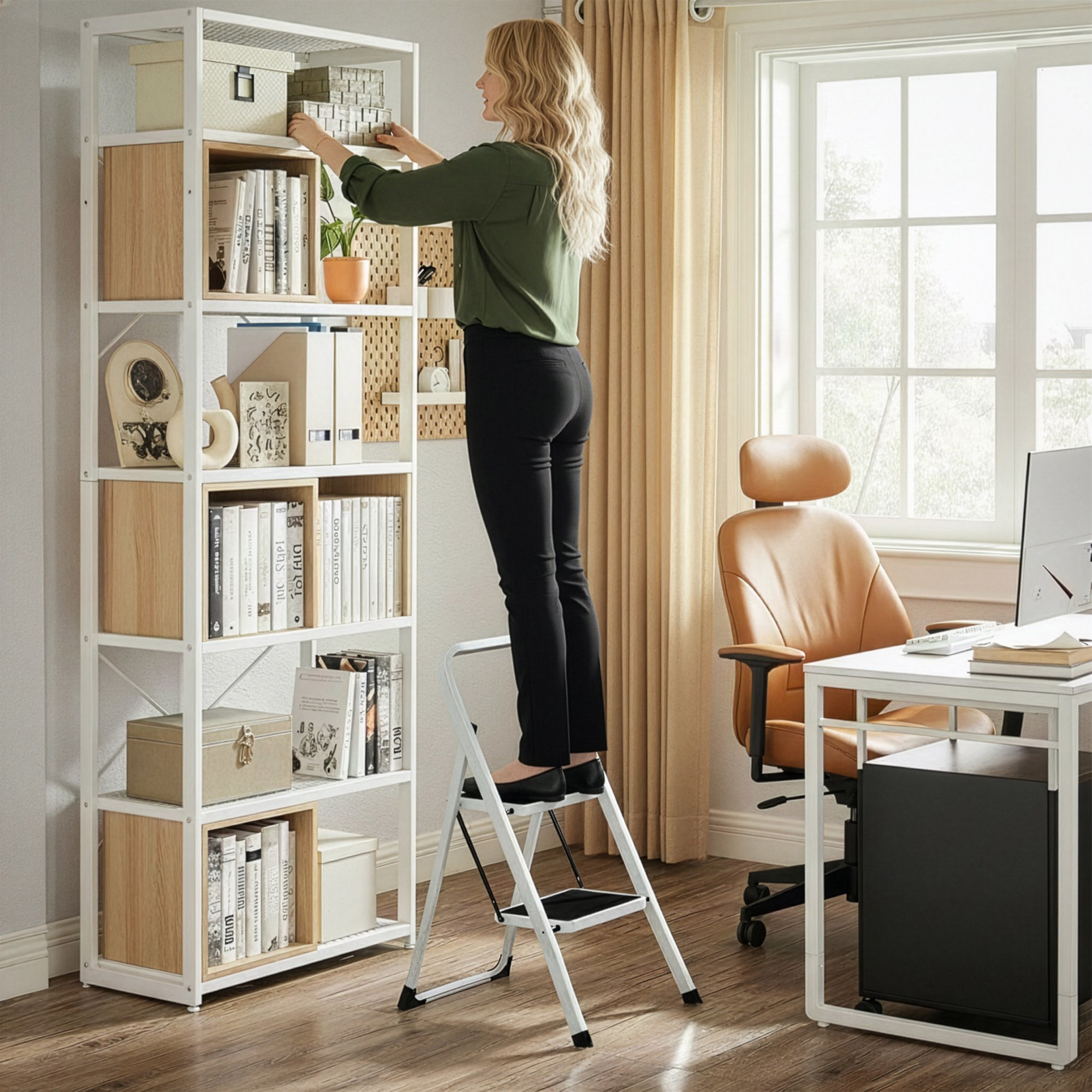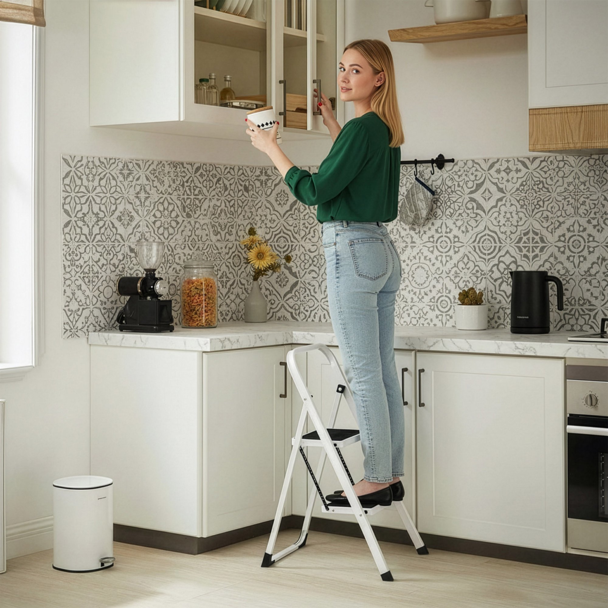 Dvoustupňový žebřík Stige nabízí pohodlnou a funkční oporu pro každodenní úkoly v domácnosti, když potřebujete bezpečnou a vyvýšenou polohu bez nutnosti velkého žebříku. Umožňuje vám snadno dosáhnout na vyšší police, skříňky nebo okna, což šetří čas a energii. Jeho pevná a stabilní konstrukce, protiskluzové komponenty a kompaktní rozměry zajišťují pohodlí a pocit bezpečí a po dokončení lze žebřík snadno složit a uskladnit, a to i v malém prostoru.