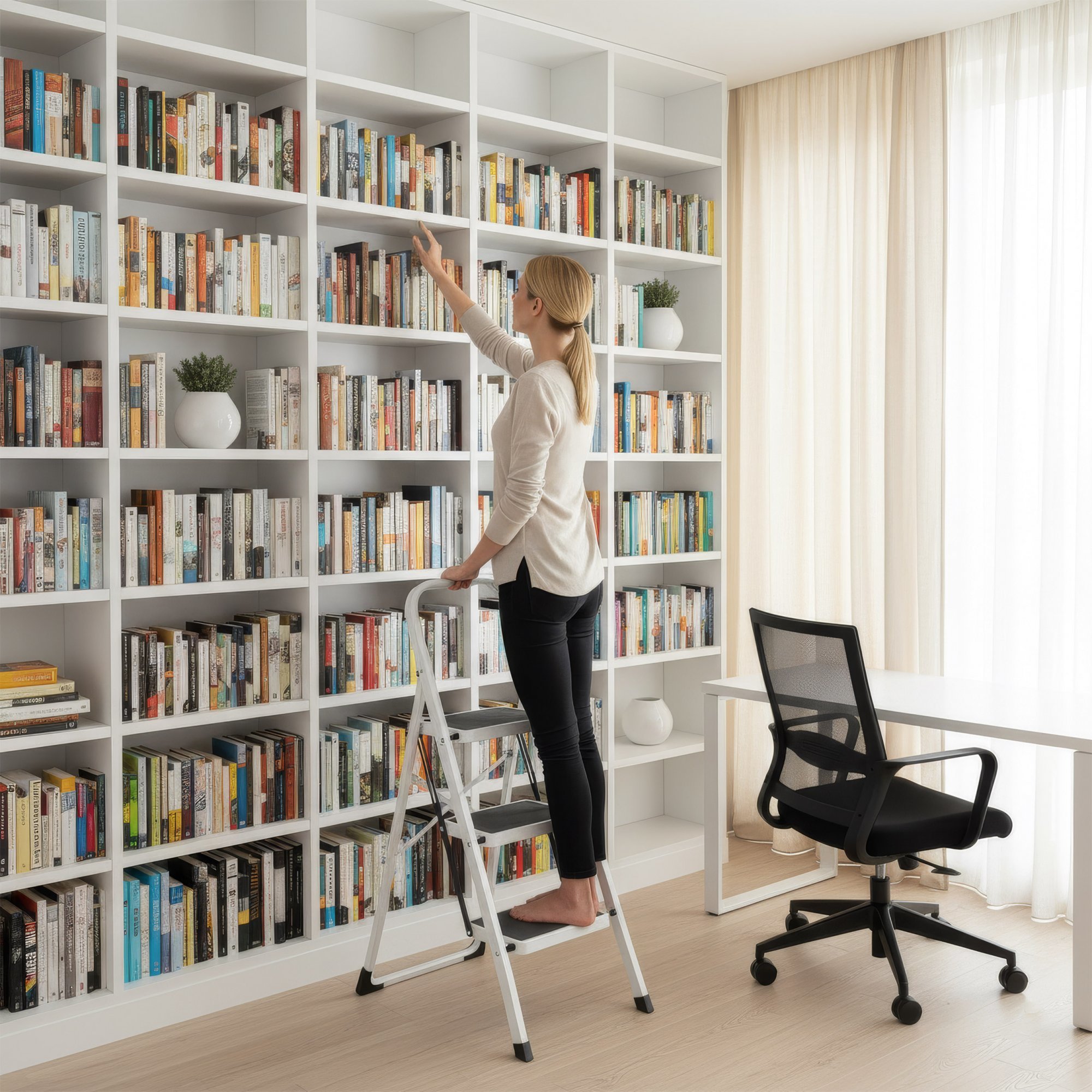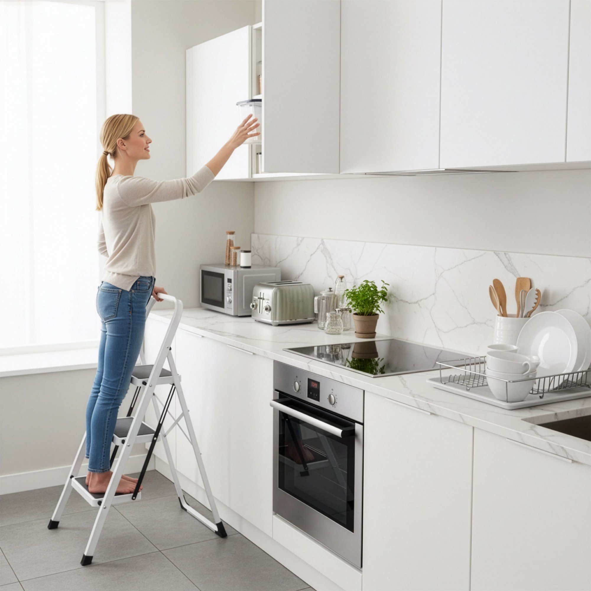 Třístupňový žebřík Stige nabízí pohodlnou a funkční oporu pro každodenní úkoly v domácnosti, když potřebujete bezpečnou a vyvýšenou polohu bez nutnosti velkého žebříku. Umožňuje vám snadno dosáhnout na vyšší police, skříňky nebo okna, což šetří čas a energii. Jeho pevná a stabilní konstrukce, protiskluzové komponenty a kompaktní rozměry zajišťují pohodlí a pocit bezpečí a po dokončení lze žebřík snadno složit a uskladnit, a to i v malém prostoru.
