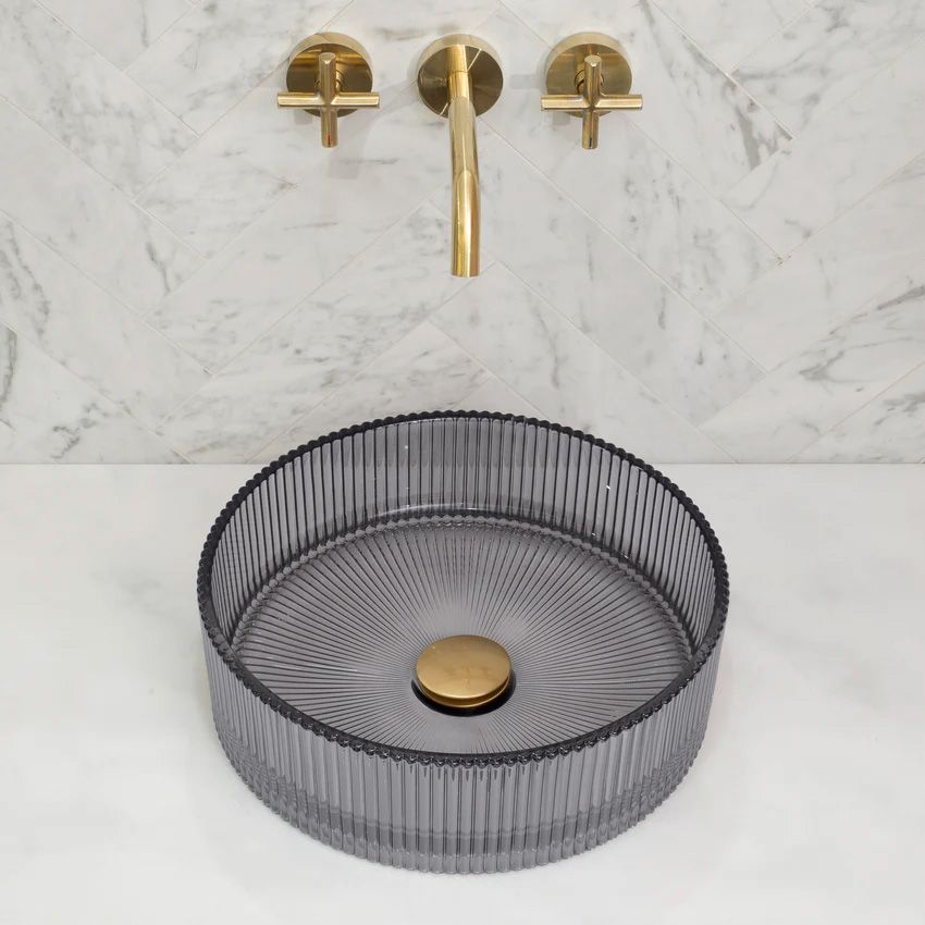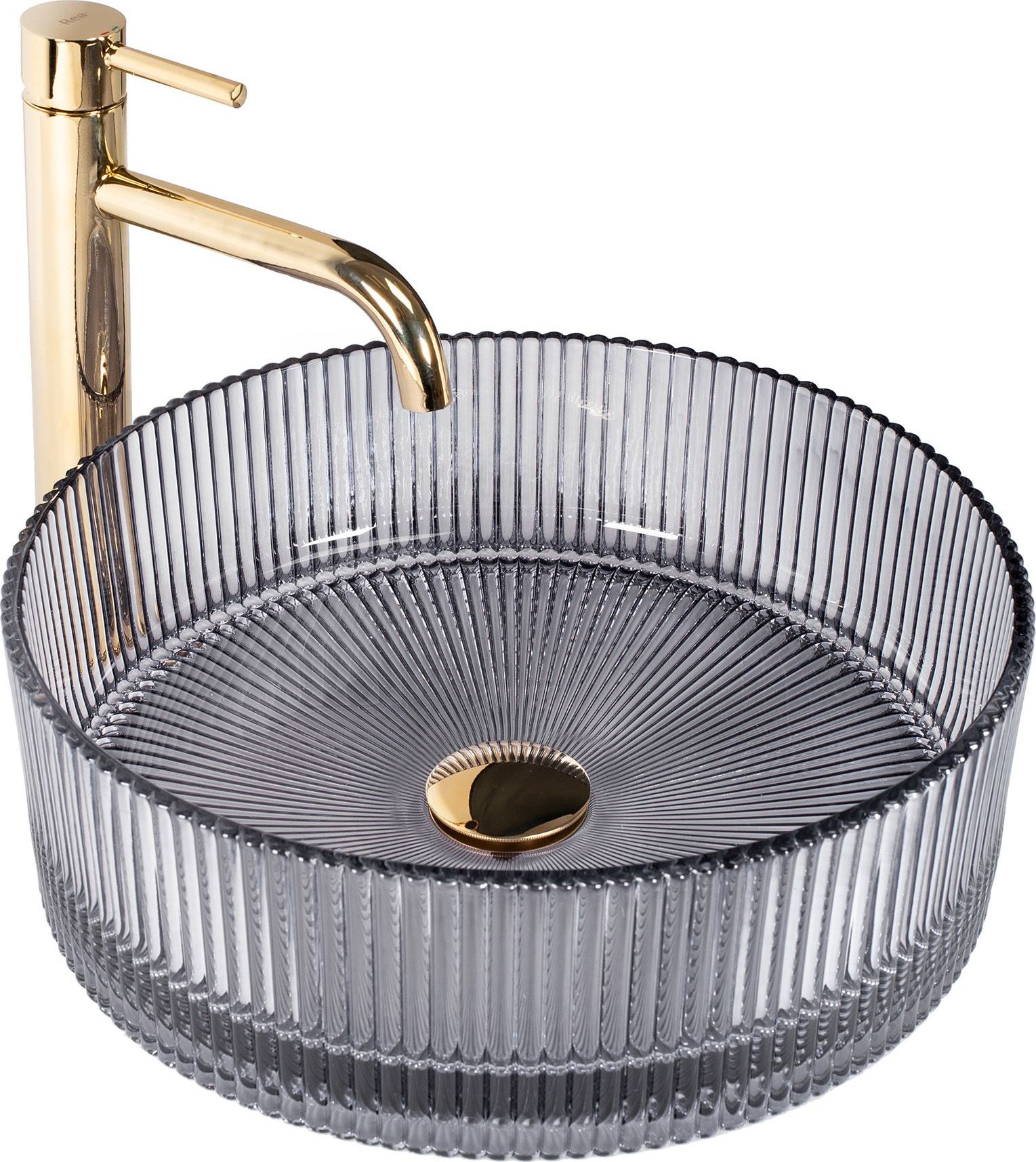 Skleněné umyvadlo INGRID je vyrobeno z odolného kouřového skla se vzory připomínající křišťálový lustr. Nabízí velmi netradiční vzhled, který odráží dopadající světlo všemi směry.