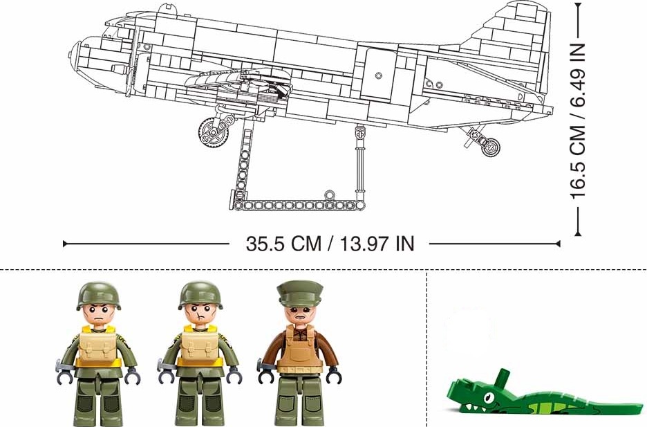 Tato detailní stavebnice od značky Sluban představuje velké vojenské dopravní letadlo v klasickém olivově zeleném provedení. Model je navržen tak, aby nabídl jak realistický vzhled, tak i spoustu herních prvků, díky nimž si děti mohou vytvářet své vlastní akční příběhy. Letadlo má charakteristický dvoumotorový design s širokým trupem a propracovanými křídly. Otevírací části umožňují přístup do kokpitu i do zadní nákladové sekce, kde mohou minifigurky a vybavení simulovat výsadkové operace. Nechybí ani funkční podvozek a otočné vrtule. Součástí setu jsou také minifigurky vojáků s příslušenstvím, které obohacují hru o další možnosti. Vybavení jako bedny, zbraně a výstroj zvyšují celkovou herní hodnotu stavebnice.