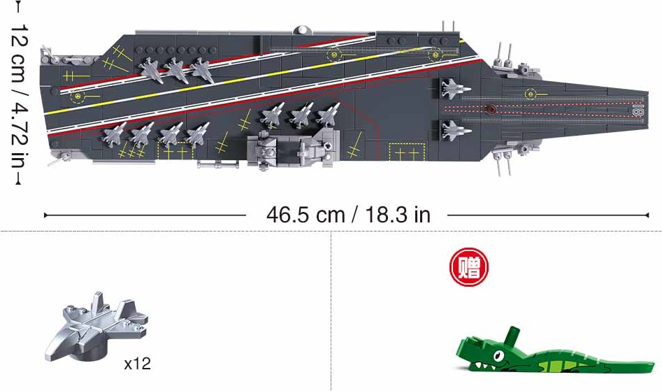Na souši, ve vodě, ve vzduchu. Ovládněte prostor! Loď se svou délkou 46,5 centimetrů přináší širokou škálu herních možností. Plochy k přistání může využít 12 letounů, které jsou součástí balení. Inovativní stavebnice Sluban je možno kombinovat s podobnými stavebnicemi mnoha dalších významných výrobců. Jsou vyráběny z kvalitního, nezávadného a odolného ABS plastu. Každá stavebnice je opatřena návodem k sestavení a balena v pestře potištěné papírové krabičce.