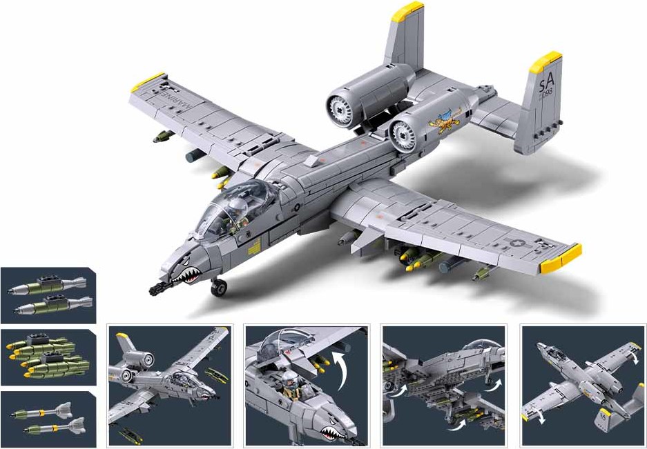 Letoun A10CS je atraktivní nejen na hraní, ale také jako sběratelský kousek, který skvěle vynikne i na poličce.Inovativní stavebnice Sluban je možno kombinovat s podobnými stavebnicemi mnoha dalších významných výrobců. Jsou vyráběny z kvalitního, nezávadného a odolného ABS plastu. Každá stavebnice je opatřena návodem k sestavení a balena v pestře potištěné papírové krabičce.