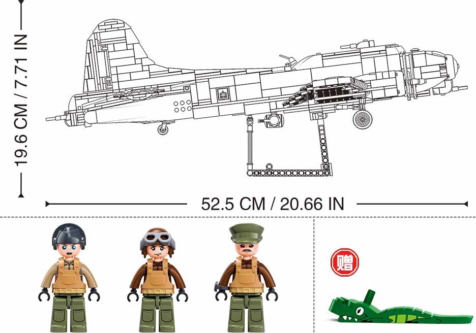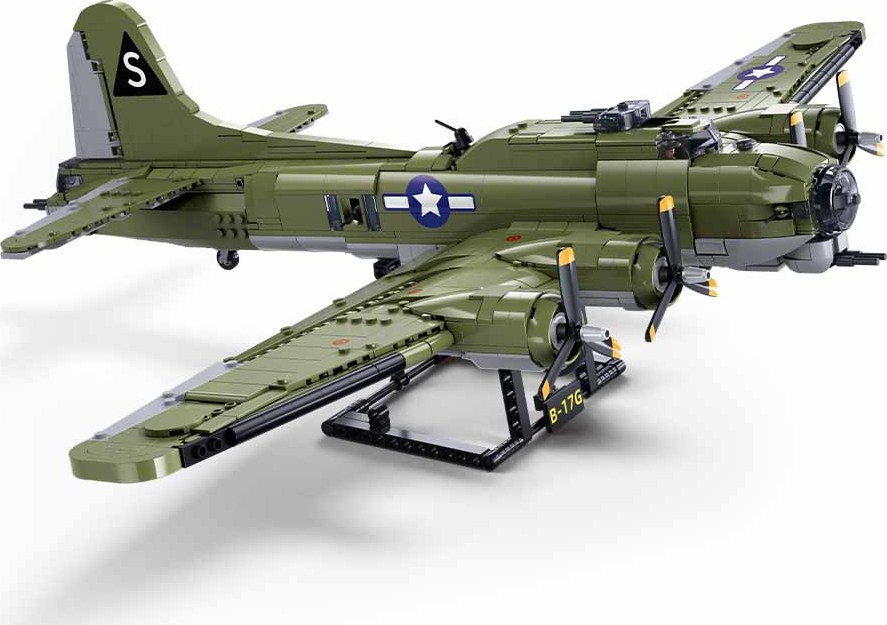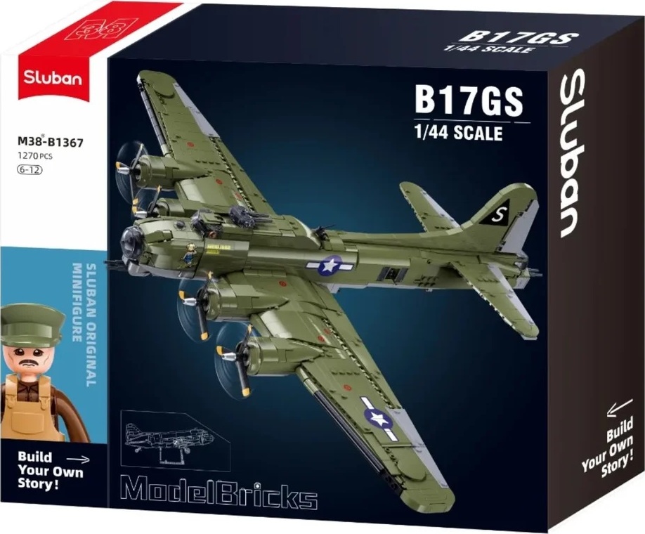 Stavebnice Sluban model Bricks B-17G Flying Fortress představuje detailní model legendárního amerického těžkého bombardéru Boeing B-17G Flying Fortress, který byl jedním z nejznámějších a nejpoužívanějších letounů druhé světové války. Tento čtyřmotorový bombardér, přezdívaný „Létající pevnost“, sloužil v americkém armádním letectvu (USAAF) a proslavil se svou odolností, unesl až 8 tun pum, dosahoval rychlosti přes 460 km/h a jeho posádku tvořilo deset členů.Model v měřítku 1 : 44 je sestaven z 1270 kvalitních plastových dílků vyrobených z pevného a odolného ABS plastu, který zaručuje stabilní a trvanlivou konstrukci. Stavebnice věrně zachycuje skutečný tvar letounu, včetně detailně zpracovaného trupu, křídel, ocasní části, motorů, průhledného kokpitu a charakteristického olivově zeleného zbarvení s americkým leteckým označením. Model nabízí funkční prvky, jako je výsuvný a zatahovací podvozek, otočné vrtule a pohyblivé části křídel a směrovky, které umožňují nastavit letoun do letové nebo přistávací polohy. Součástí balení je také vystavovací stojan s označením typu B-17G, díky kterému lze model elegantně prezentovat. Stavebnice obsahuje tři minifigurky členů posádky a drobné doplňky, které doplňují realistický vzhled a herní možnosti. Po sestavení dosahuje model délky přibližně 52 cm, což odpovídá realistickým proporcím originálu v uvedeném měřítku. Stejně jako ostatní modely řady Sluban Model Bricks je i tato stavebnice plně kompatibilní se stavebnicemi dalších výrobců, včetně LEGO®, což umožňuje rozšíření modelu nebo kombinaci dílků s jinými sadami. Stavebnice podporuje rozvoj jemné motoriky, prostorové představivosti, trpělivosti, kreativity a smyslu pro detail, a zároveň přibližuje významný kus historie letectví.