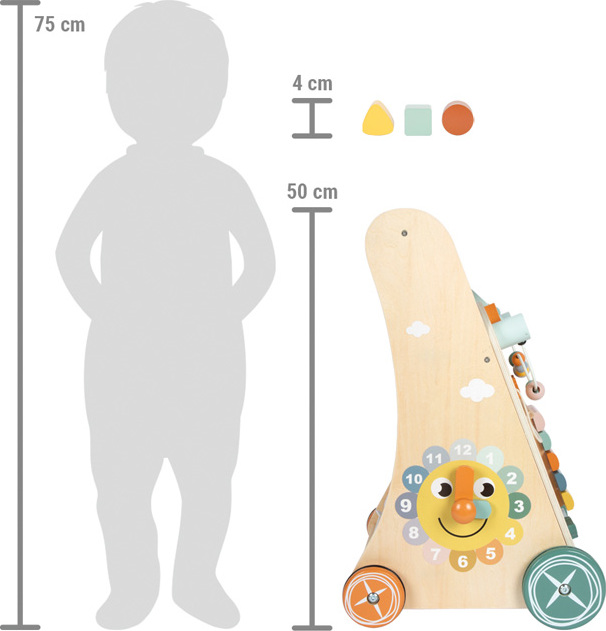 Vydejte se na safari a prozkoumejte svět! Toto stabilní chodítko se třemi stěnami s aktivitami v designu safari nabízí velké množství herních prvků, které podněcují všechny smysly, a doprovází malé průzkumníky při jejich prvních krůčcích. Se slonem, krokodýlem, tukanem, lvem, tygrem, zebrou a jejich přáteli bude každý krok novým dobrodružstvím. Dřevěný xylofon s 5 klávesami poskytuje akustickou stimulaci, zatímco četné posuvné prvky a korálkový labyrint s různě velkými barevnými korálky trénují jemnou motoriku. Ozubená kola, překlápěcí destičky, vkládačka se 3 různými kostičkami a hodiny s pohyblivými ručičkami nabízejí nejen zábavu ale také učení prostřednictvím hry. Síť na zadní straně chodítka poskytne praktický úložný prostor na hračky. Kola mají gumové kroužky navržené tak, aby zabraňovaly prokluzování a umožňovaly tichou a plynulou jízdu. Chodítko je stabilní také díky trojúhelníkovému tvaru a pro své barevné provedení v jemných pastelových barvách s velkým množstvím přiznaného přírodního dřeva se stane atraktivním doplňkem každého dětského pokojíčku. Skvěle se hodí k ostatním hračkám z produktové řady Safari.