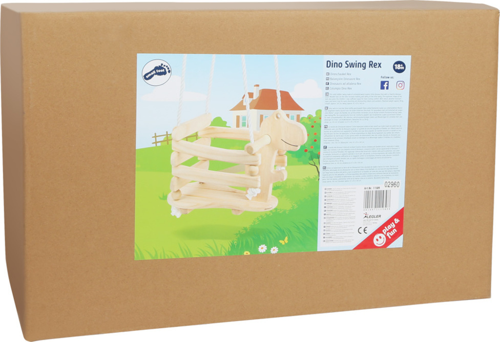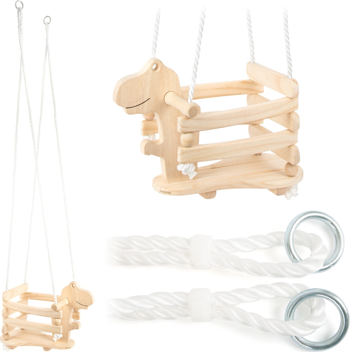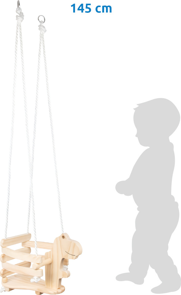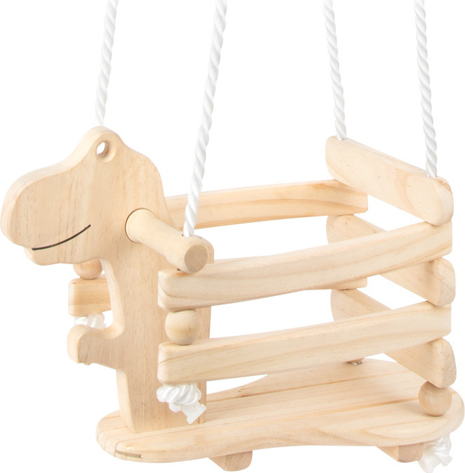 Tato houpačka pro batolata z neošetřeného masivního dřeva potěší malé fanoušky dinosaurů. Flexibilní zabezpečení dítěte ze všech stran, které sahá až do výšky hrudníku, stejně jako dvě rukojeti, zajišťují mladým „dinosaurovým jezdcům“ velikou podporu, jistotu a bezpečnost. Ergonomický tvar sedáku také dává dětským nohám dostatečnou volnost pro větší houpací pohodlí. S robustními lany odolnými proti povětrnostním vlivům a kovovými kroužky pro rychlé zavěšení, lze použít jak venku, tak i uvnitř.
