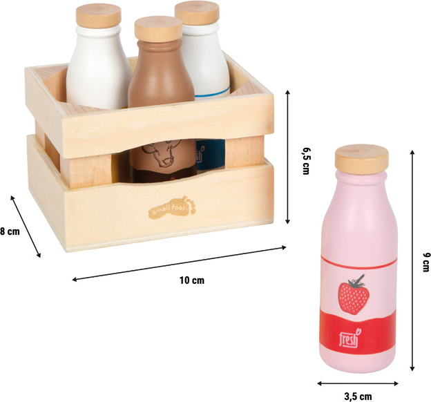 Dopřejte dětem ještě více zábavy při hře na obchod nebo vaření! Tato kvalitní dřevěná bedýnka obsahuje čtyři pečlivě zpracované lahve s mléčnými nápoji – klasické mléko, ovesné mléko, jahodové mléko a čokoládové mléko. Díky výrazným barvám a jednoduchým symbolům jsou jednotlivé druhy snadno rozpoznatelné i pro menší děti, a to i bez znalosti čtení.Set je ideální doplněk do dětského obchůdku, kuchyňky nebo pro jakékoli kreativní hraní na nakupování, přípravu jídla a servírování. Láhve jsou vyrobeny z odolného dřeva a mají propracovaný design přizpůsobený dětským rukám. Praktická dřevěná bedýnka nejen usnadňuje přehledné uložení, ale také podporuje pořádek při hře. Ať už si děti hrají na snídani v pokojíčku, provozují vlastní obchod nebo chystají piknik, tento set přináší realistický prvek do každodenního hraní. Podporuje rozvoj fantazie, komunikačních dovedností i sociální interakce. Zároveň skvěle zapadá do produktové řady „fresh“ a lze jej snadno kombinovat s dalšími herními potravinami.