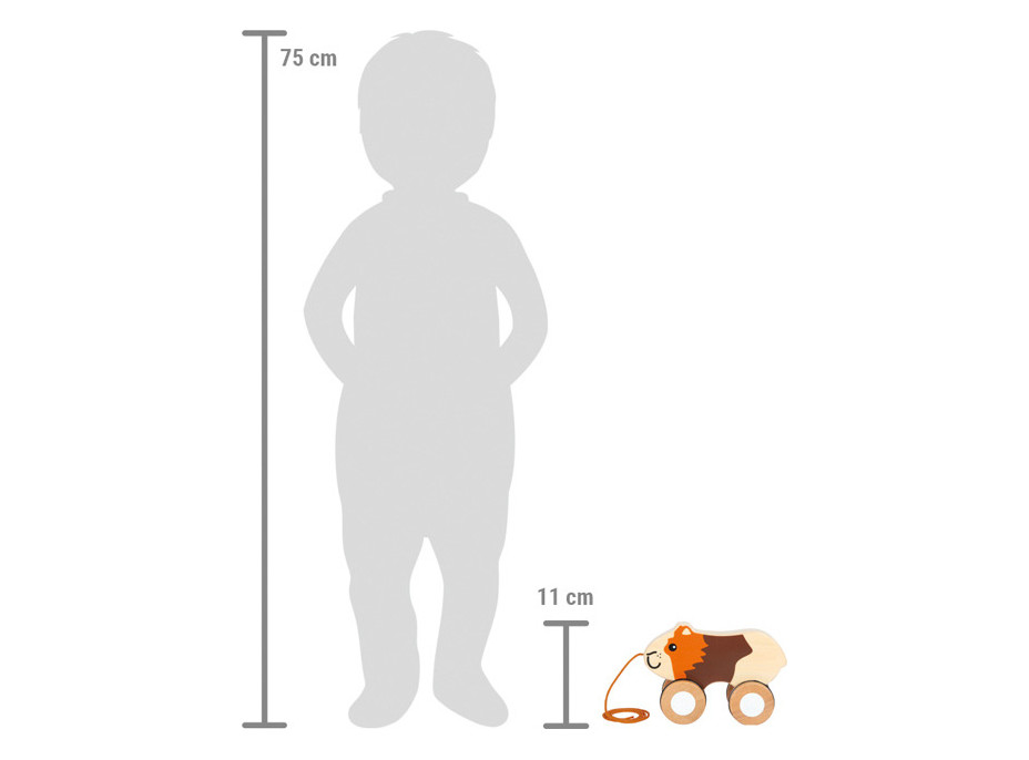 Roztomilé morče na provázku vyrobené z vysoce kvalitního pevného dřeva se jistě stane nezapomenutelným kamarádem každého dítka při jeho prvních samostatných krůčcích. Morčátko na kolečkách se dá snadno táhnout na provázku a povzbuzuje malé děti k lezení a chůzi. Užijí si tak při procházkách spoustu zábavy. Pogumovaná kolečka napomáhají plynulé a tiché jízdě. Hračka podporuje rozvoj motorických dovedností a pohyblivosti.