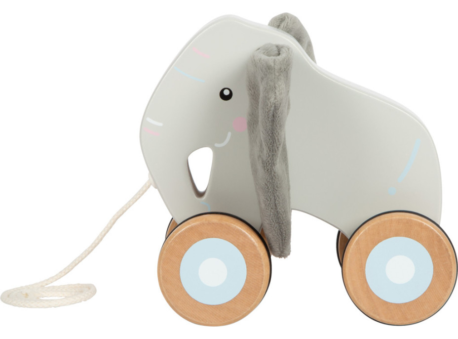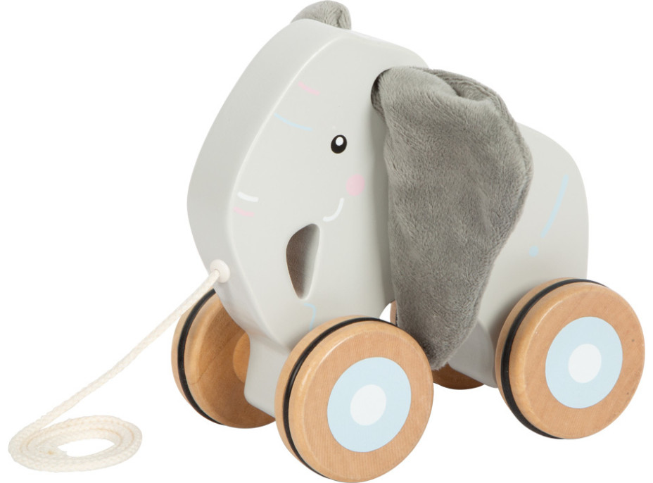 A jedeme! Roztomilý slon na provázku s velkýma, měkkýma ušima vyrobený z vysoce kvalitního pevného dřeva se jistě stane nezapomenutelným kamarádem každého dítka při jeho prvních samostatných krůčcích. Dá se snadno táhnout na provázku a povzbuzuje malé děti k lezení a chůzi. Užijí si tak při procházkách spoustu zábavy. Pogumovaná kolečka napomáhají plynulé a tiché jízdě. Hračka podporuje rozvoj motorických dovedností, pohyblivosti a smyslového vnímání. Šustivá ouška lze snadno odebrat a vyprat.