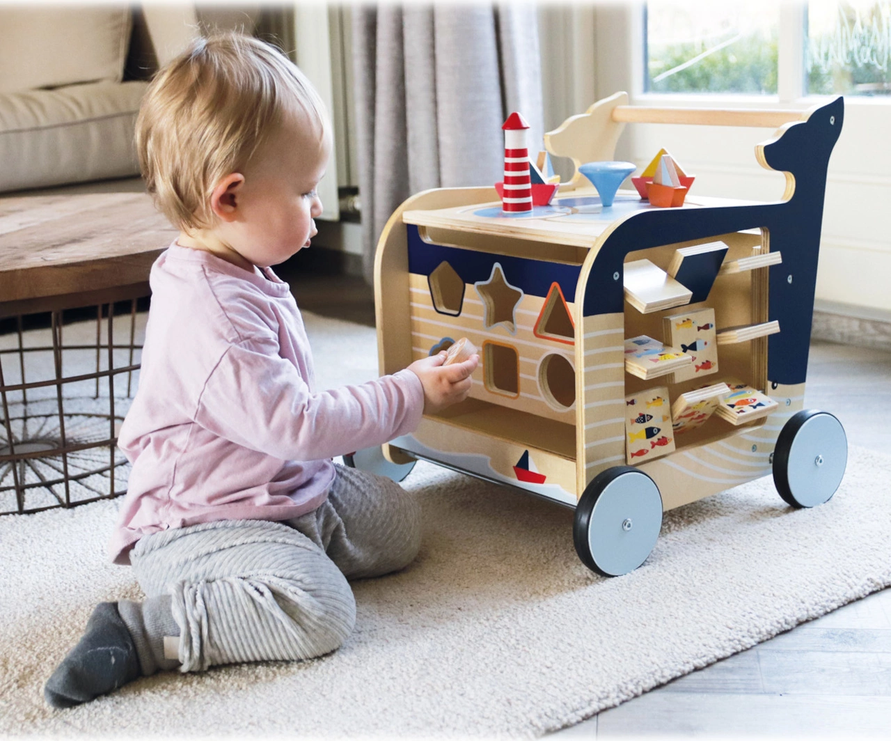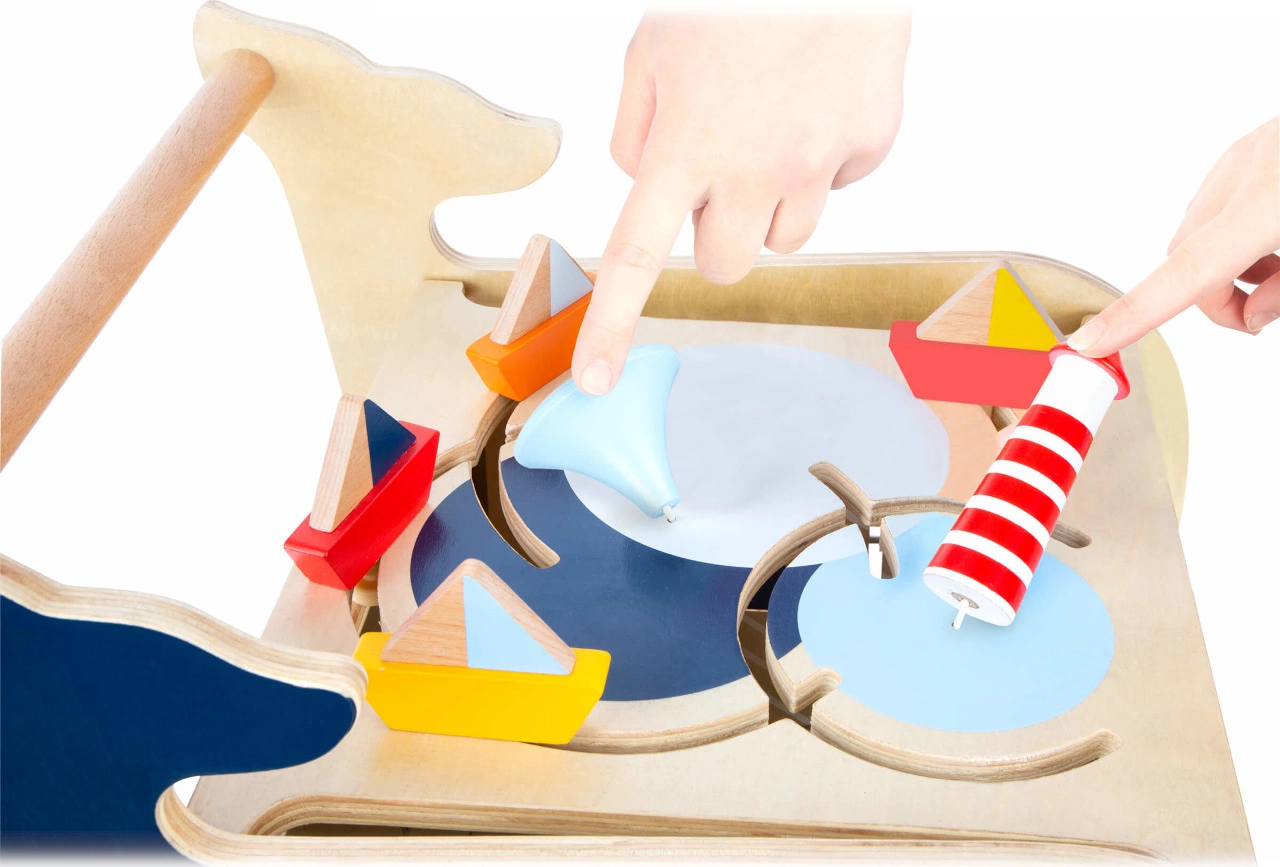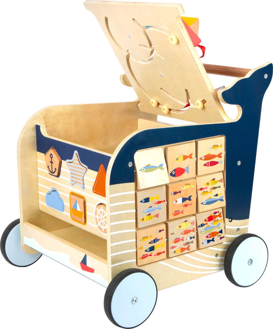 Pojďme na průzkum s velrybou! Toto dřevěné chodítko ve tvaru velryby pomůže dětem s prvními kroky a zároveň nabídne hračky k rozvoji motoriky. Chodítko se drží stylu mořského světa a jeho živočichů. Na čtyřech stranách chodítka naleznete hry jako vkládání tvarů, otáčení obrázků nebo kreslící tabulku. Děti se mohou naučit počítat, určovat světové strany nebo rozlišovat roční období. Chodítko má pogumovaná kola a je tak tiché a zároveň bezpečné. Chodítko je nahoře otevíratelné a dvířka obsahují pojistku proti přivření prstů. Můžete do něj tedy uložit všechny kostky. Najdete zde i brzdný systém, který zabrání nehodám.