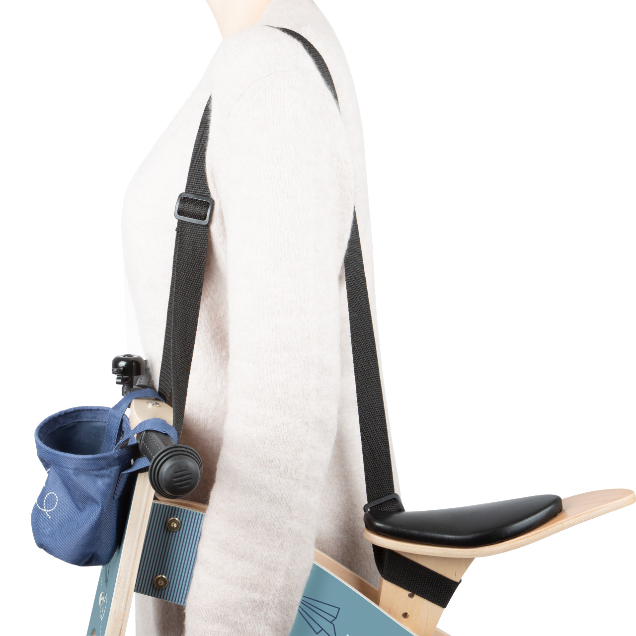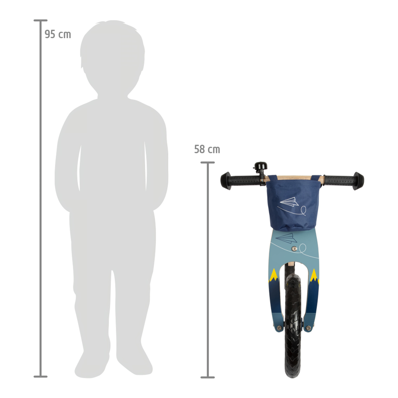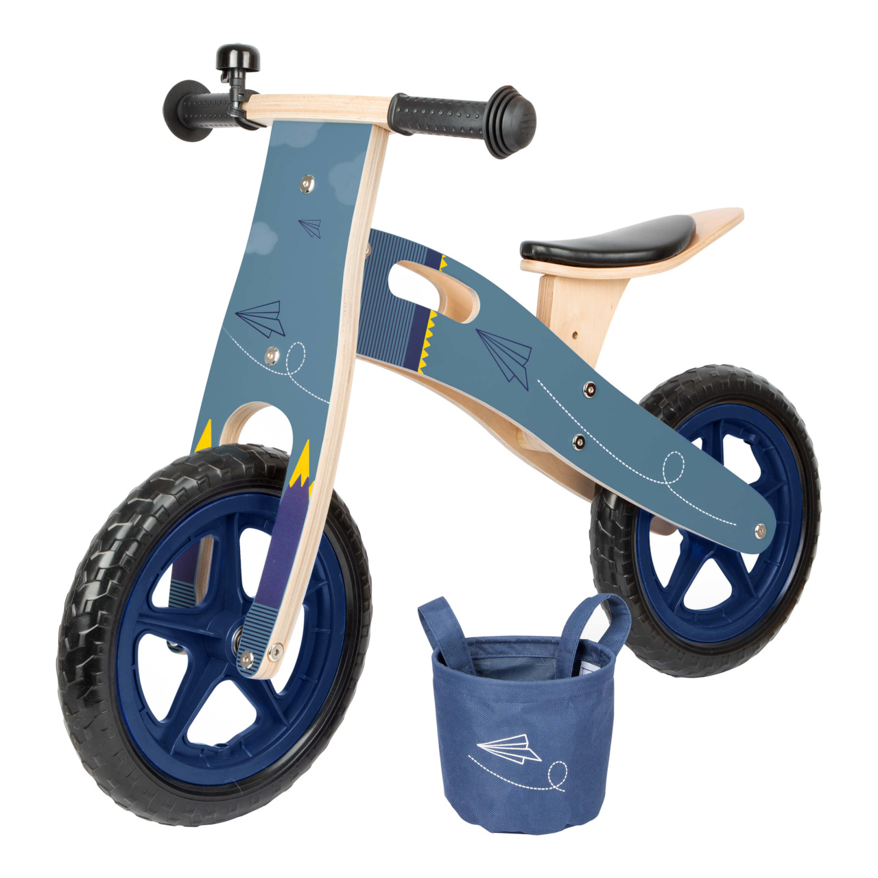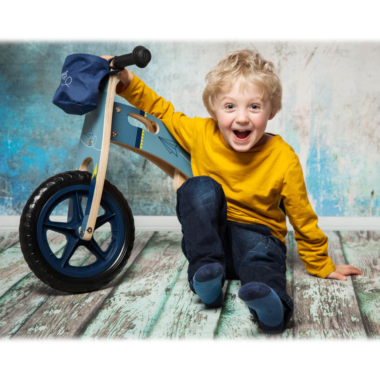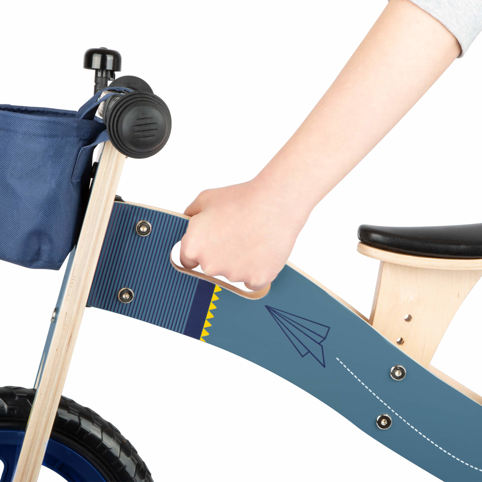 Rychlý jako stíhačka! S designem v odstínech modré a potiskem papírového letadla toto odrážedlo nadchne spíše chlapce. Sedadlo lze nastavit na tři rozdílné výšky, takže odrážedlo poroste s dětmi. Hračky si děti mohou vložit do oddělitelného košíku. Skvělé je, že když se děti unaví, mohou rodiče nést kolo přes rameno díky nastavitelnému popruhu. Pro přidanou bezpečnost je na řídítkách tlumič řízení. Zvonek, gumové rukojeti, nezničitelné EVA pneumatiky a měkké sedadlo zaručují zábavnou a bezpečnou jízdu. Balanční odrážedlo tránuje motoriku, rovnováhu a koordinaci a připravuje děti na jízdu opravdového kola.