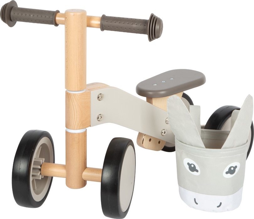 Dřevěné odrážedlo v designu oslíka, které se stane nepostradatelným pomocníkem Vašeho dítka doma i při procházkách venku. Proč namáhat nožičky, když může sednout a frčet?! Dřevěná robustní konstrukce je nejen příjemná na dotek, ale i nesmírně stabilní. Pogumovaná kola zajistí, že vaše dítě může prozkoumávat svět tiše a bezpečně, aniž by rušilo okolí. Gumové rukojeti nabídnou malým průzkumníkům pevný úchop a kontrolu nad svým vozítkem. Sedátko je nastavitelné od 22 do 25 cm, může se tak přizpůsobit výšce dítěte. Součástí je také odepínatelná taška na řídítkách v designu oslíka, která může sloužit jako praktický úložný prostor pro láhev s pitím či plyšového kamaráda. Zadní kola jsou blízko sebe a nabízejí tak dostatek prostoru pro nohy při odrazu.