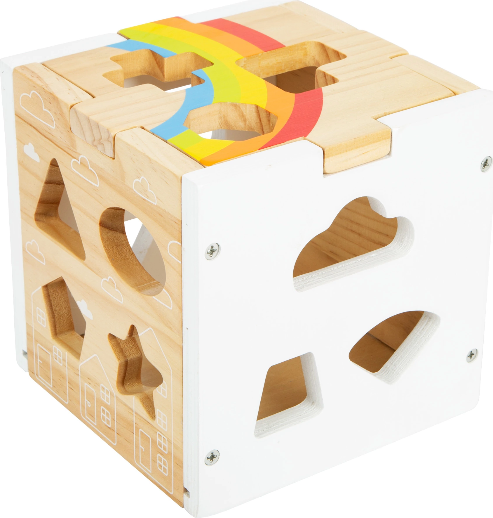 Tato moderní kostka z robustního dřeva kombinuje jednoduchý barevný design přírodního dřeva a bílé barvy doplněný barevnými dílky. Najdete zde 13 dílků různých tvarů a barev, které při vkládání do kostky trénují rozeznávání barev a tvarů u dětí a také jejich motoriku. Kromě klasických tvarů je zde i mráček, hvězda nebo domeček. Minimalistické ilustrace, oddělitelné víko, perfektní zábava pro děti.