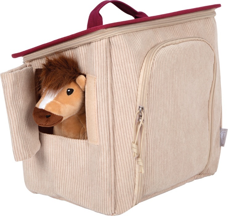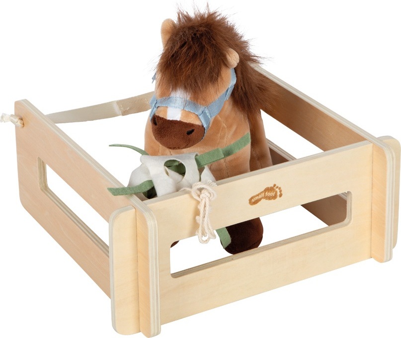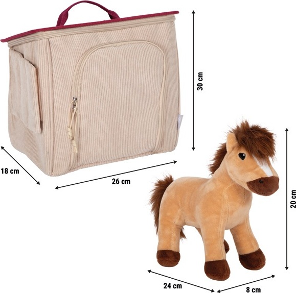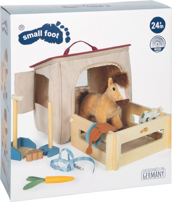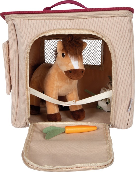 Nasedat a hrajeme si! Tento nádherně zpracovaný set s tématem koní a ježdění má vše, co malí milovníci koní potřebují ke štěstí! Hlavní roli hraje roztomilý plyšový koník, který bydlí v pevné manšestrové tašce. A teď pozor! Díky zipům se taška během chvilky promění ve stáje a zároveň slouží jako praktické úložiště pro všechno příslušenství! Ohrádku s připevněním na suchý zip můžete sestavit před stájemi, nebo ji uzavřít do kruhu jako výběh, hra tak působí opravdu realisticky. Součástí setu je: sedlo, dečka a uzdečka,mrkvička a síť na seno pro krmení a dokonce i "mistička na bobky" s hráběmi, lopatkou a dřevěnými koblížky. Sen každého malého milovníka koní: detailní hrací set, který spojuje kreativní hraní s realistickými prvky. Připravený ke hře hned po vybalení, ideální i na cesty!