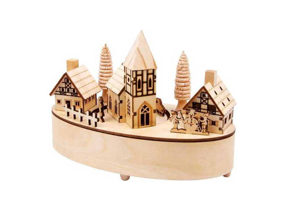 V kouzelné zimní kulise z překližky hraje tichá vánoční hudba a v kostele zní "Tichá noc, svatá noc". Malé žluté LED žárovky vytvářejí jemné světlo do pokojů ve všech domečcích! Baterie nejsou součástí balení.