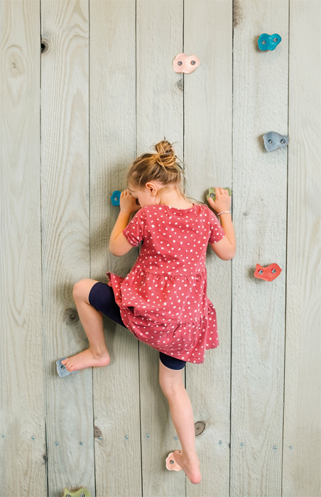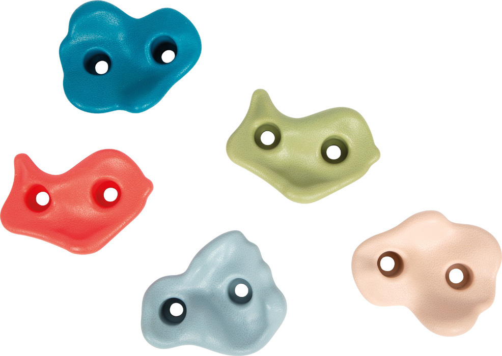 Tato sada 5 lezeckých chytů různých tvarů, vyrobených z odolného plastu, přináší zábavu z lezení v moderních barvách na každou stěnu. Ať už na dřevěné desce v dětském pokoji, na zahradní zdi nebo na hrací věži. Díky přilnavému povrchu, dvoubodovému upevnění odolnému proti protočení a dodávanému montážnímu kování lze chyty individuálně rozmístit. Snadno se tak přizpůsobí věku, velikosti i lezeckým schopnostem dítěte a umožní vytvářet nápadité lezecké trasy s vysokou herní a sportovní hodnotou. Barevně navržené lezecké chyty poskytují bezpečné a robustní prvky pro každou dětskou lezeckou stěnu - ideální pro lezení v interiéru i venkovní použití. Texturovaný povrch zajišťuje pevný a jistý úchop, a to i pro malé dětské ručičky. Díky přiloženému kování je sada ihned připravena k použití, ať už jako rozšíření stávající lezecké stěny, nebo pro vytvoření zcela nové lezecké dráhy. Náročnost lze snadno upravit podle rozmístění chytů - od jednoduchých tras pro začátečníky až po náročnější výzvy pro zkušenější malé boulderisty. Lezení přirozeně posiluje sílu, vytrvalost a koordinaci a zároveň podporuje sebevědomí, vnímání vlastního těla i odvahu, důležité dovednosti pro zdravý vývoj dítěte.