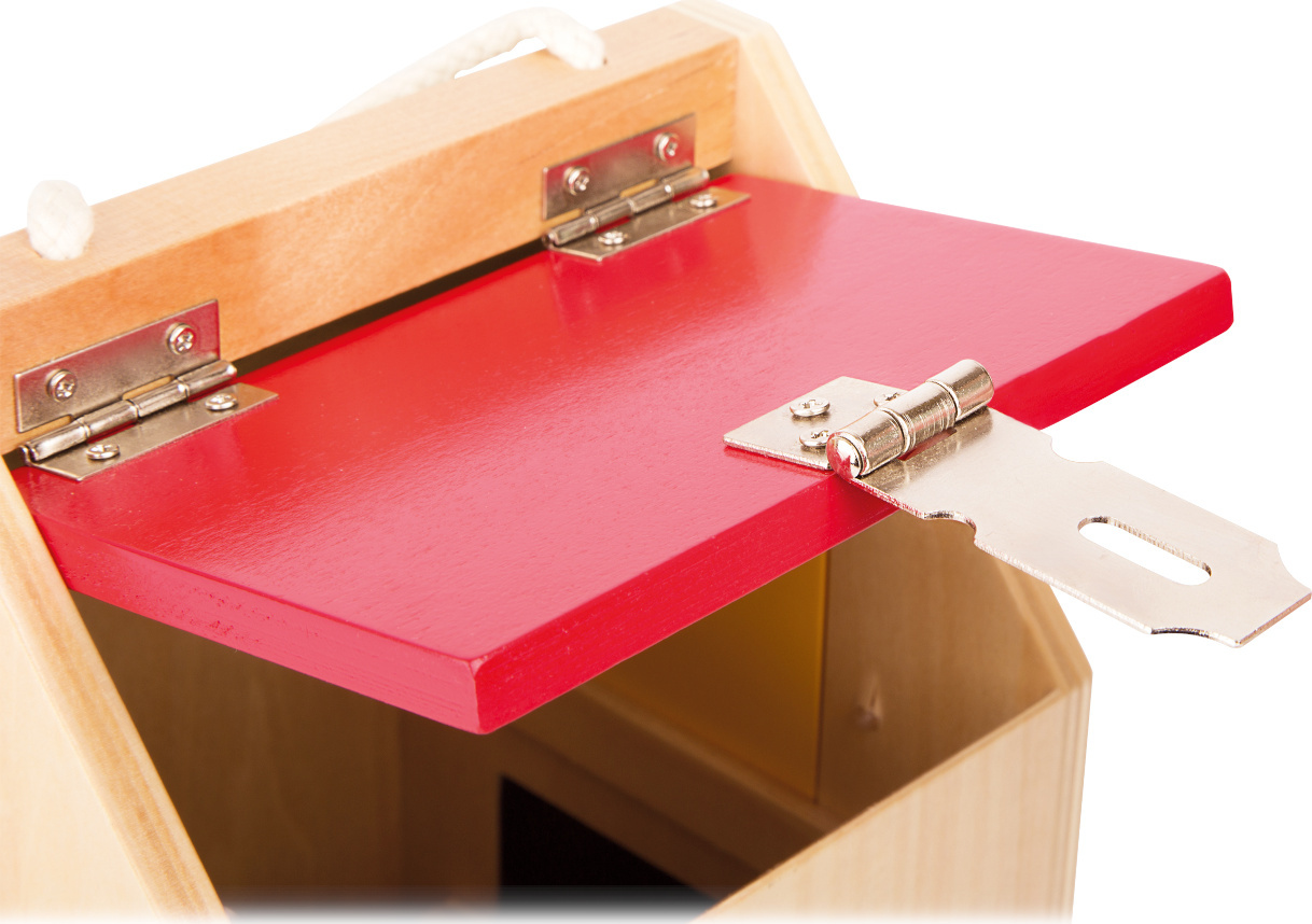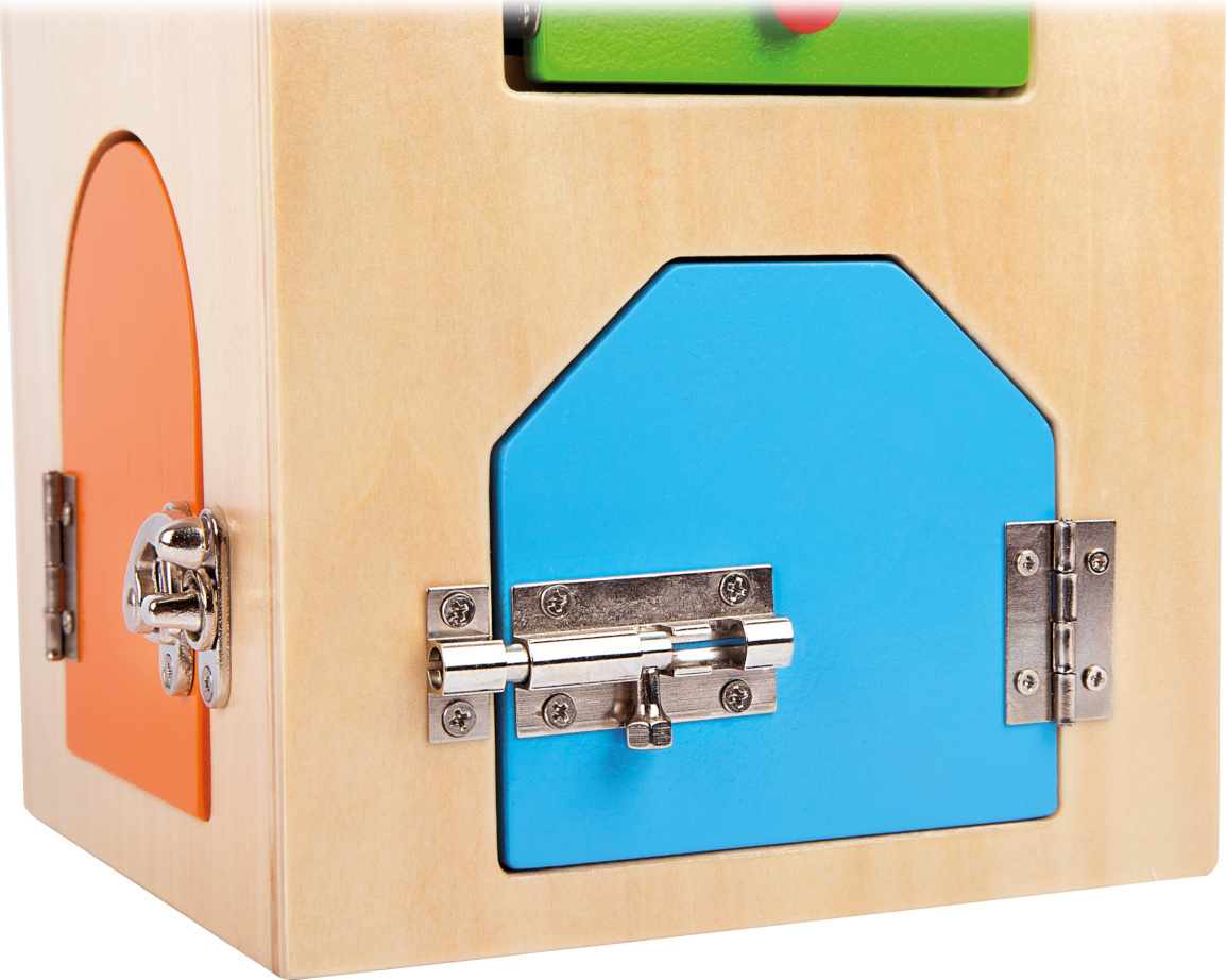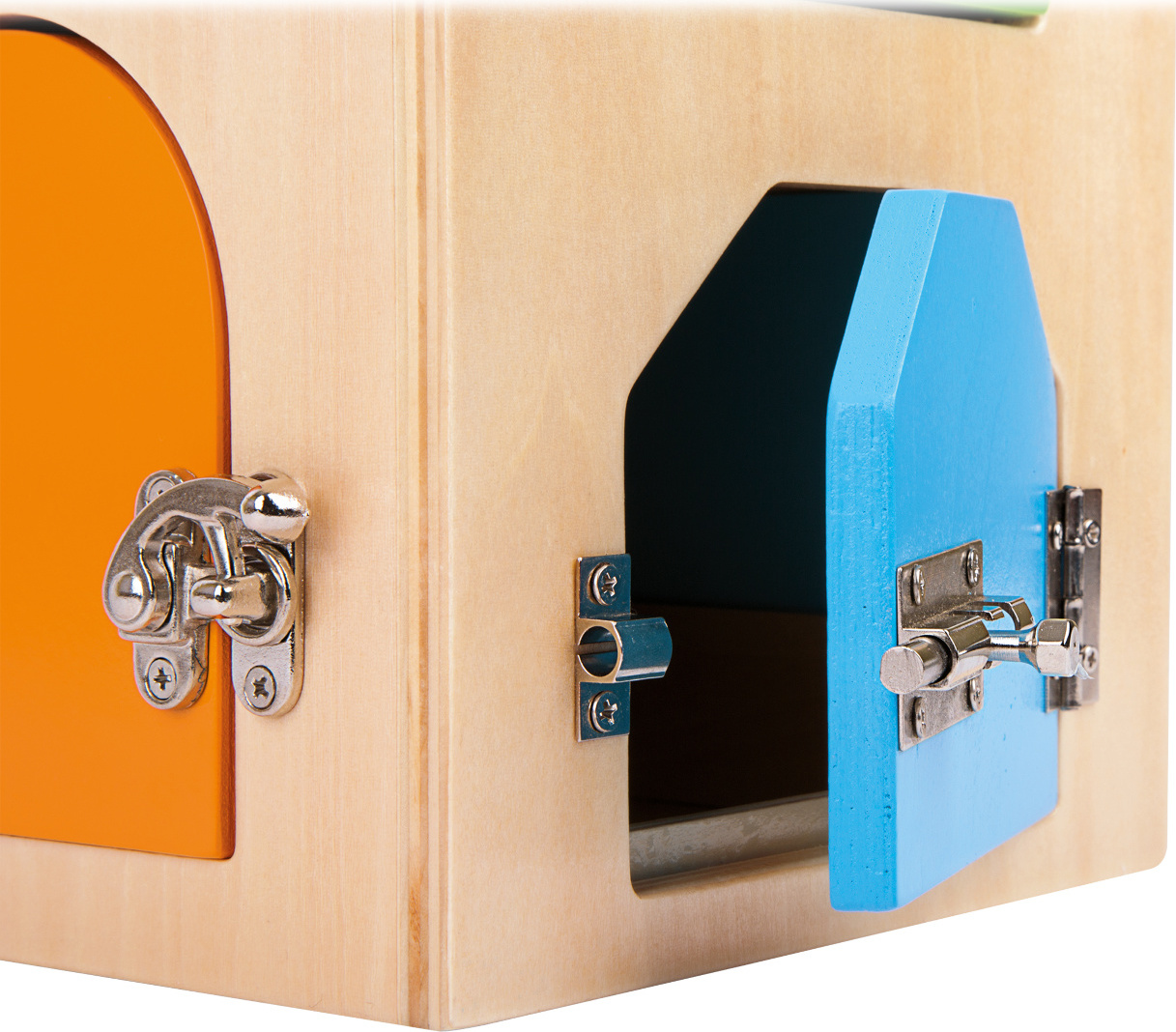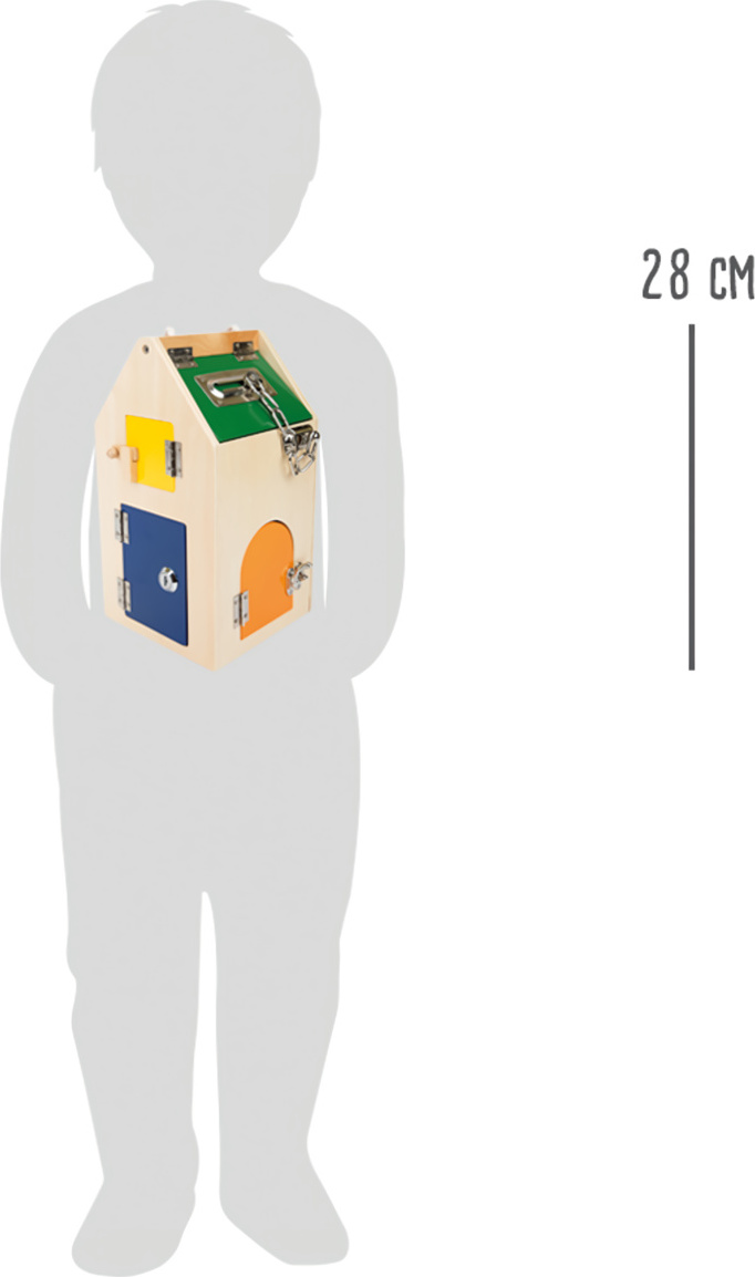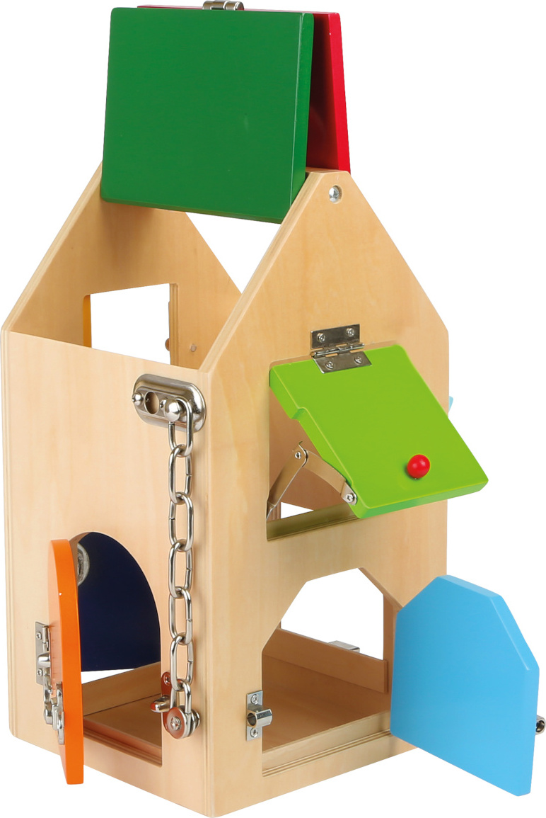 Na tomto dřevěném domku s vysoce kvalitním zpracováním nejdete U zámek a cylindrický zámek, různé šrouby, páky, panty a bezpečnostní řetěz, které trénují motoriku dětí. Navíc se velmi snadno přepravuje a zajišťuje "klíčové" zážitky! Vyroben z odolného dřeva a pevných kovových částí.