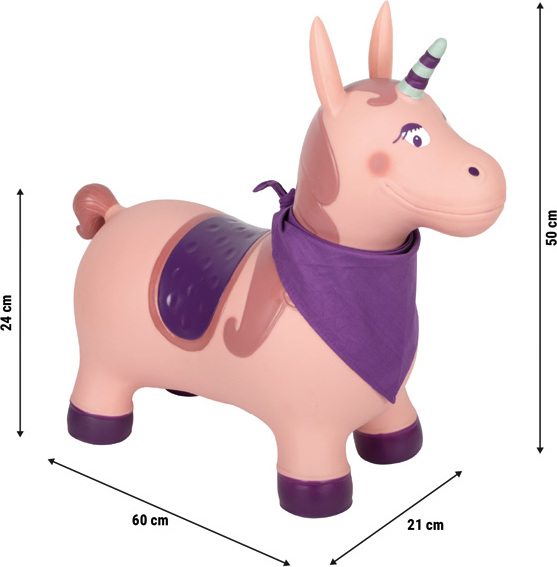 Roztomilé nafukovací skákací zvířátko v podobě jednorožce přináší dětem spoustu pohybu a zábavy doma i venku. Díky milému designu a měkkému bavlněnému šátku si ho děti okamžitě zamilují.Roh a uši jsou snadno uchopitelné, takže děti mohou bezpečně skákat a zároveň rozvíjet rovnováhu. Zvířátko je vyrobeno z odolného materiálu, který se snadno čistí, a s nosností až 50 kg a výškou sedáku 24 cm je ideální pro menší děti.Hra s jednorožcem navíc posiluje svaly zad, trupu a nohou a pomáhá trénovat rovnováhu a koordinaci pohybů, což z něj činí zábavnou a zároveň prospěšnou aktivitu pro děti.
