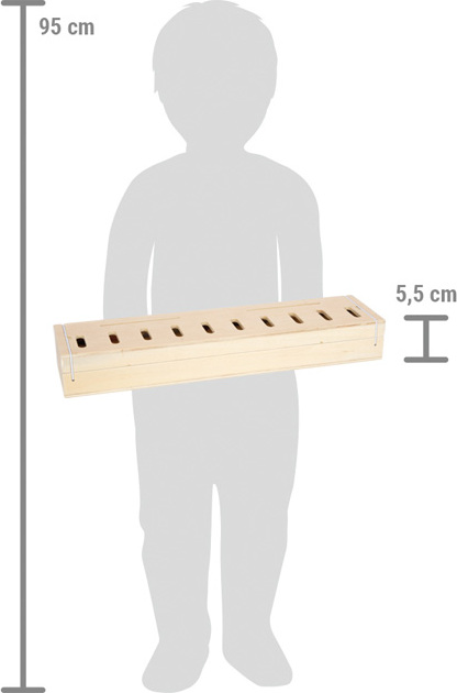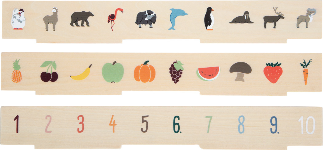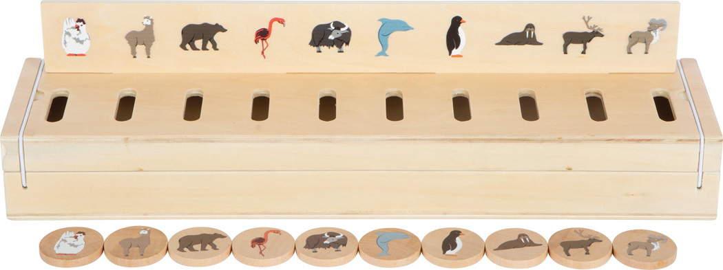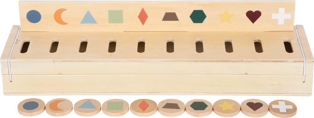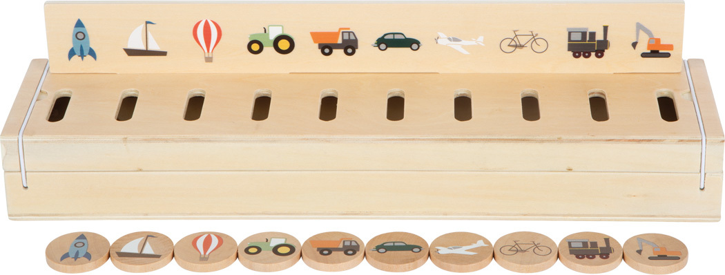 Tento dřevěný zásobník nabízí spoustu motivů k objevování se třemi oboustrannými vkládacími panely a 60 ks obrázkových žetonů na téma doprava, zvířata, čísla, tvary, oblečení, ovoce a zelenina. Při třídění a vkládání žetonu do krabičky si děti trénují jemnou motoriku, rozpoznávání barev a tvarů zábavným způsobem. Motivy lze také využít k učení slov a zdokonalování slovní zásoby zábavnou formou. Deset samostatných přihrádek uvnitř dřevěného zásobníku a dvě západky na gumičku zajišťují bezpečné uložení obsahu. Praktická učební hračka vhodná i když jste na cestách.