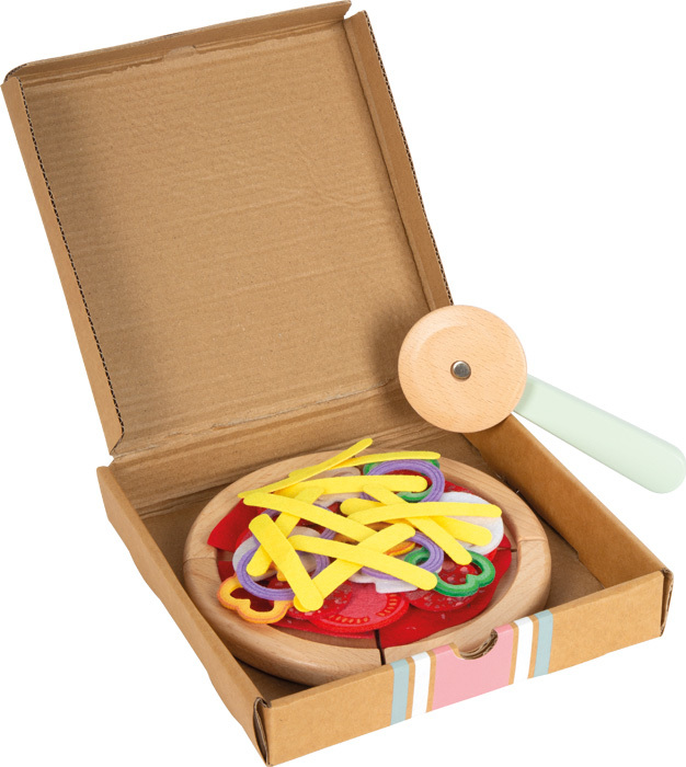 Dnes je čas na pizzu! Skvělá zábava pro malé kuchaře! Tato pevná kartonová krabice na pizzu s veselým potiskem ukrývá vše, co děti potřebují k přípravě vlastní pizzy. Uvnitř najdou čtyři dřevěné plátky pizzy, které jsou spojeny suchým zipem – dají se tedy snadno „nakrájet“ pomocí přiloženého dřevěného kráječe. Stejně jako opravdová pizza! Sada obsahuje i různé plstěné ingredience: cibuli, houby, papriku, rajčata, klobásu a sýr. Nechybí ani oboustranná rajčatová omáčka – z jedné strany s potiskem bylinek, z druhé bez. Děti si tak mohou pizzu upravovat podle vlastní fantazie znovu a znovu. Hra podporuje jemnou motoriku, kreativitu i rozvoj sociálních dovedností při společné hře. Skvěle se hodí jako doplněk do dětské kuchyňky nebo k samostatnému hraní na pizzéra. Krabice slouží nejen ke hře, ale i k uložení všech dílů. Díky tomu je hračka snadno skladná a děti mají po hraní uklizeno raz dva.