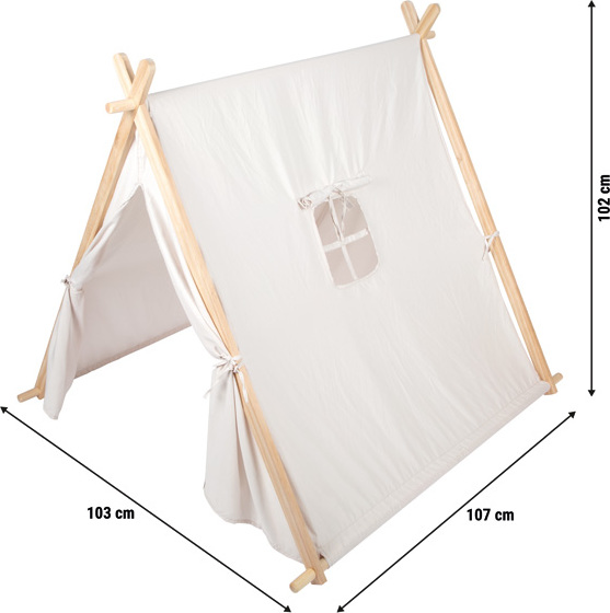 Hrajte si, sněte, odpočívejte. Tento stylový herní stan pro vnitřní pužití z pevného dřeva a kvalitní látky je dokonalým útočištěm pro nápaditou a kreativní hru v dětském pokoji. Robustní dřevěná konstrukce a jemný látkový potah vytvářejí útulné místo pro hraní, čtení i mazlení.Boční okénko propouští dostatek světla, zatímco srolovatelný vstup umožňuje otevřený přístup dovnitř. Stan se tak snadno promění v tábor pro malé dobrodruhy, domeček pro panenky a plyšáky nebo klidný čtecí koutek.Moderní design s jemnými barvami se hodí do každého interiéru a dodá dětskému pokoji hřejivou atmosféru. Díky mnoha možnostem využití se tento herní stan rychle stane oblíbeným místem všech malých objevitelů.