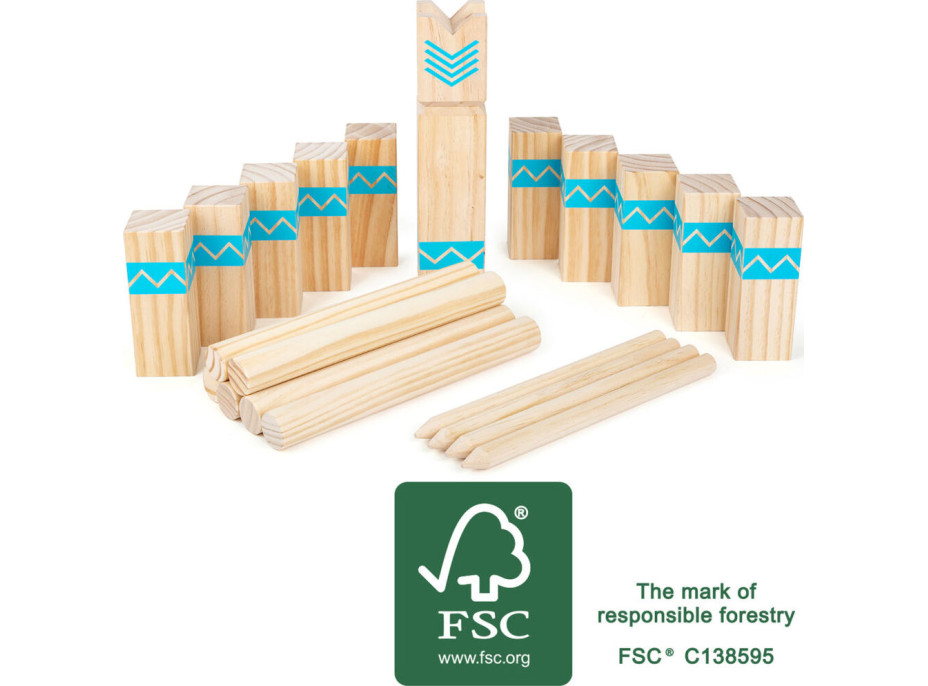 Aktivní zábava! Tato napínavá hra zručnosti je vyrobena ze 100% certifikovaného FSC® dřeva. Je vhodná pro mladší i starší hráče, je to totiž hra přesnosti. Má krásný design, tato venkovní hra upoutá pozornost každého ať už na zahradě nebo na pláži. Malými tyčkami označíte herní pole, většími tyčkami pak házíte a snažíte se shodit hranoly s modrým označením. Velikost pole si nastavte sami podle toho, jaká náročnost hry vám vyhovuje. Kdo dokáže porazit vikingského krále?
