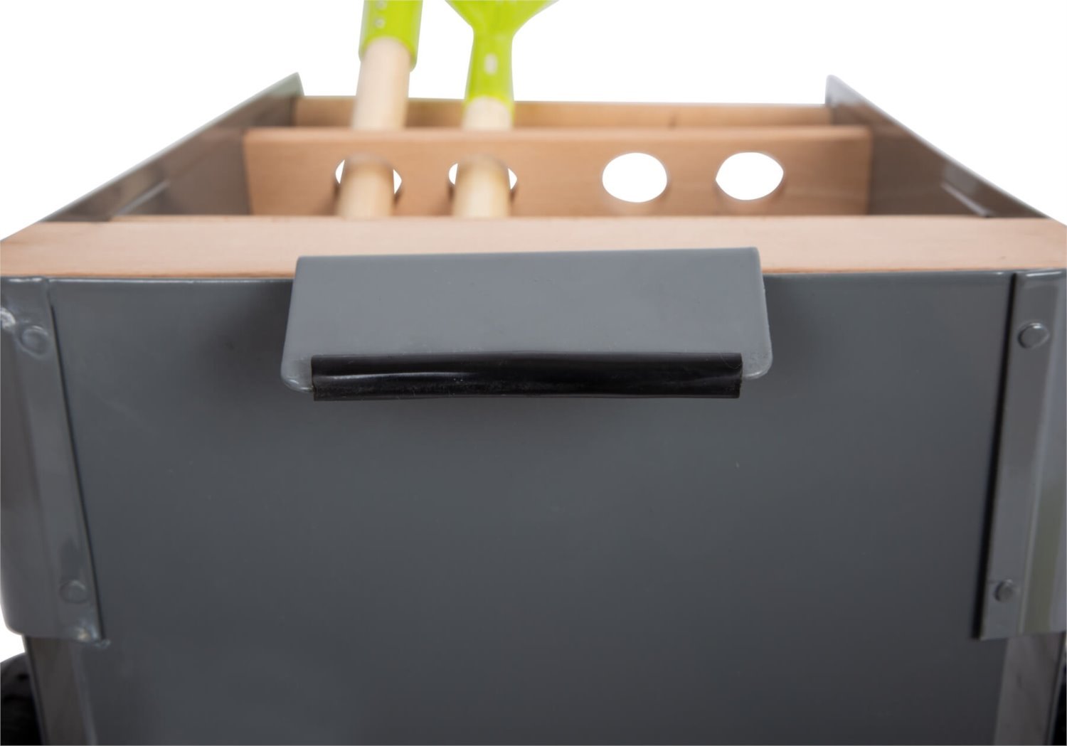 Dětský zahradní set pro malého zahradníka a pěstitele. Hračka je vyrobena z kvalitního dřeva a oceli. Sada je tvořena kovovým vozíkem na kolečkách s dřevěnými držáky na nářadí. Součástí vozíku jsou rýč, hrábě, lopatky, hraběčky a květináč.