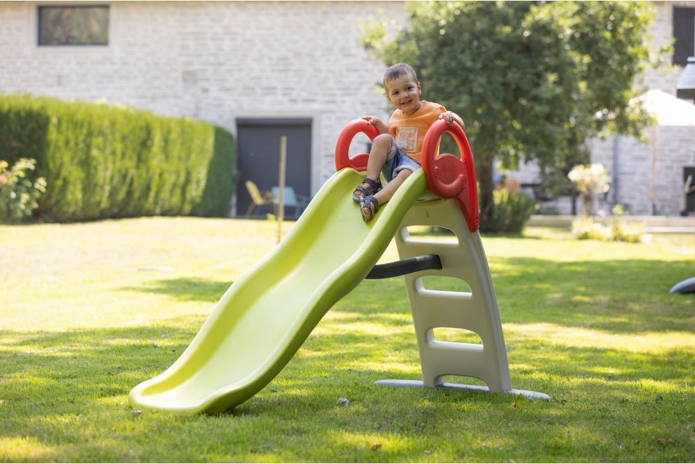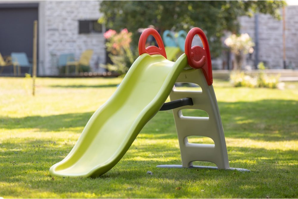 Zvlněná zahradní skluzavka má pěkné veselé barvy - zelená, červená a šedá se bude krásně vyjímat na každé zahradě.