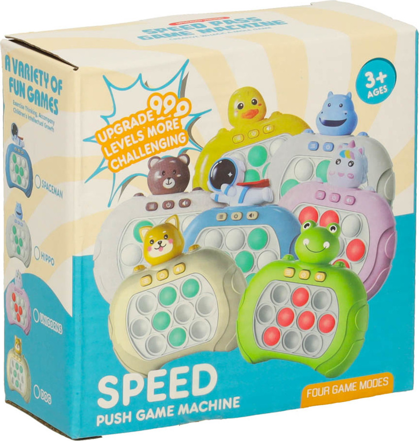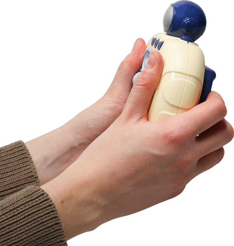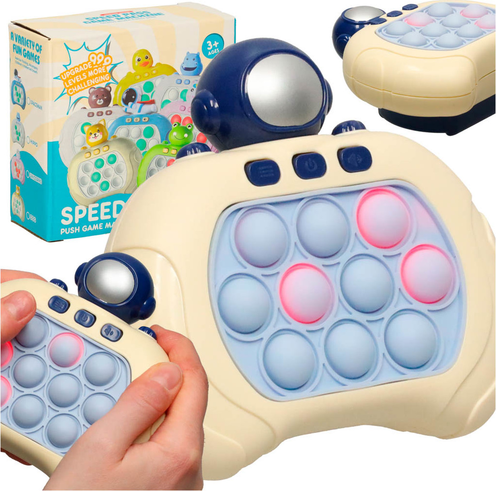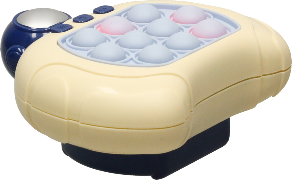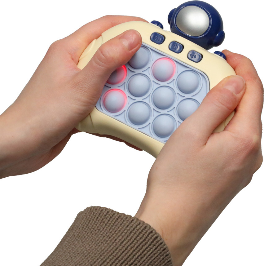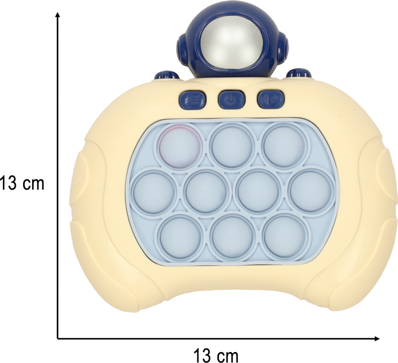 Gumová tlačítka při stisknutí vydávají charakteristický, uspokojivý zvuk „lupnutí“. Chcete-li hru restartovat, jednoduše stiskněte tlačítko na zadní straně zařízení. Hra je napájena třemi bateriemi AAA (nejsou součástí balení) a má čtyřúrovňové ovládání hlasitosti. Ergonomický tvar usnadňuje držení hračky a modrý astronaut na krytu usnadňuje kooperativní hru. Produkt podporuje rozvoj jemné motoriky, reflexů a zručnosti rukou a očí u dětí.