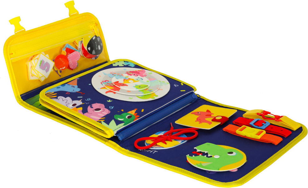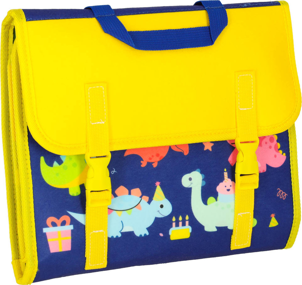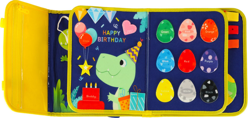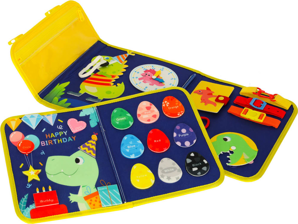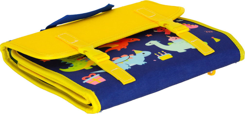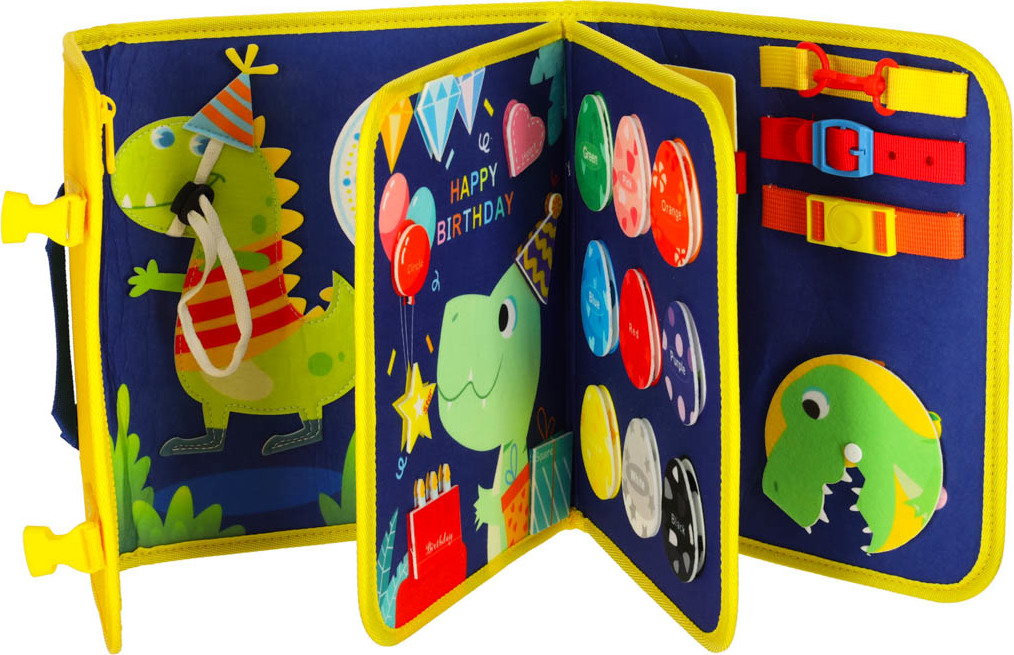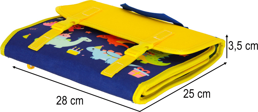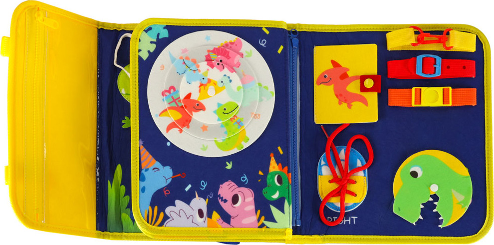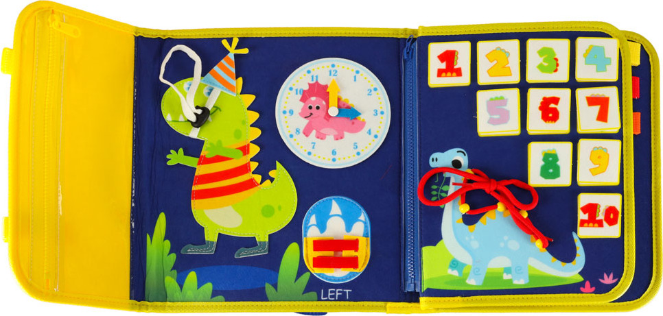 Barevná plstěná tabule s dinosaury vypadá jako klasická školní taška. Ergonomický tvar a výztuhy umožňují její pohodlné přenášení do školy nebo školky. Používání tabule umožňuje pohodlné osvojování a upevňování znalostí metodou učení hrou. Smyslová manipulační tabule s motivem dinosaurů má prvky, které jsou užitečné při učení jazyka, tvarů, barev a čísel. Některé prvky na tabuli jsou napsány v angličtině, což umožňuje dítěti osvojit si a upevnit slovní zásobu. Uvnitř se mimo jiné nachází hodinový ciferník s ručičkami, který bude užitečný při učení čtení času. Tabuli lze také využít k tomu, aby se děti naučily počítat nebo si zavazovat tkaničky. Množství prvků, s nimiž může dítě komunikovat, mu pomůže procvičit koordinaci oko-ruka a úchop.