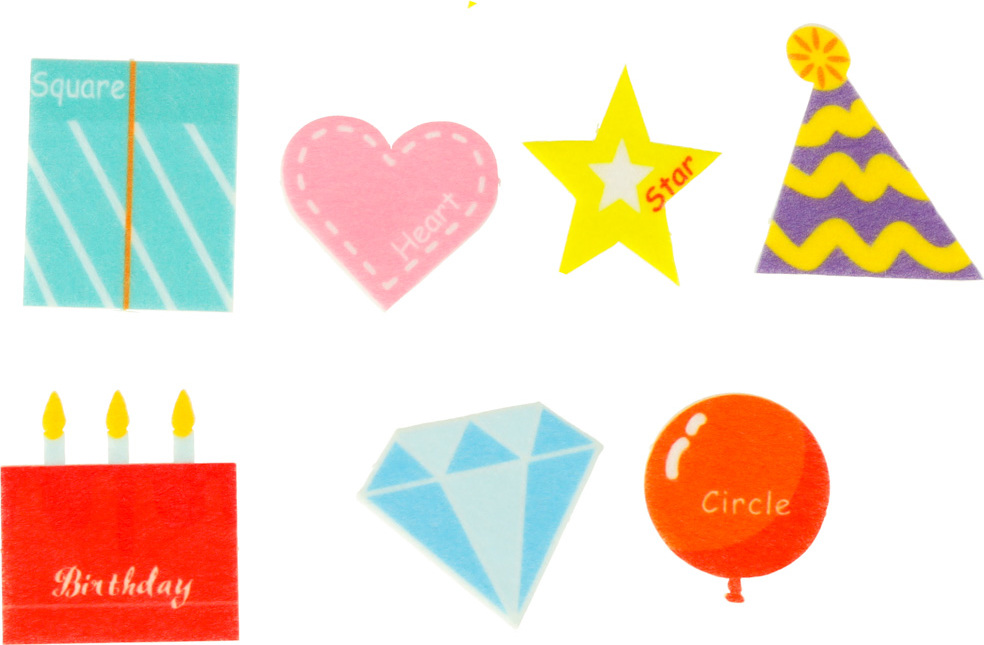 - Samolepky: srdce, balónky, hvězda, dort, dárek, kuželovitá narozeninová čepice, dinosaurus
